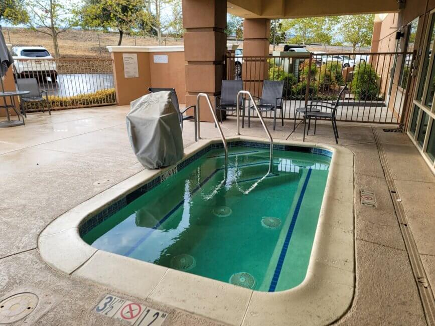 The heated pool is located outside at the back of the building. The pool area is fenced in, and you need your room key to get in. You will also need the room key to get back into the hotel or you must walk all the way around to the main entrance at the front. The pool is a decent size and there are a few pool chaise loungers as well as pool tables and chairs spread out around the pool. The whirlpool is located inside the same area but more towards the hotel building.