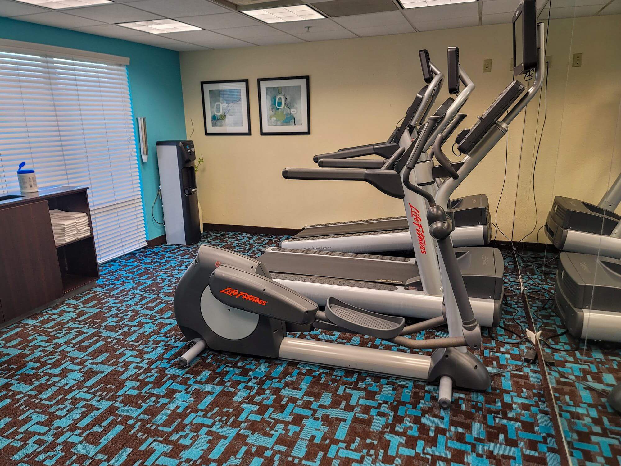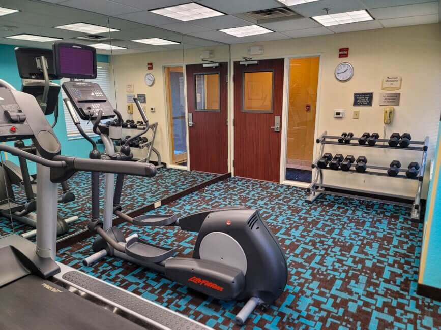 The fitness center is located down the left hallway of the hotel and to the right side where another hallway leads back out to the parking lot in the back. The fitness center is on your right, and you can’t miss it as there is pretty good signage pointing you in the right direction. The fitness center is a bit small. It has a suitable selection of equipment.