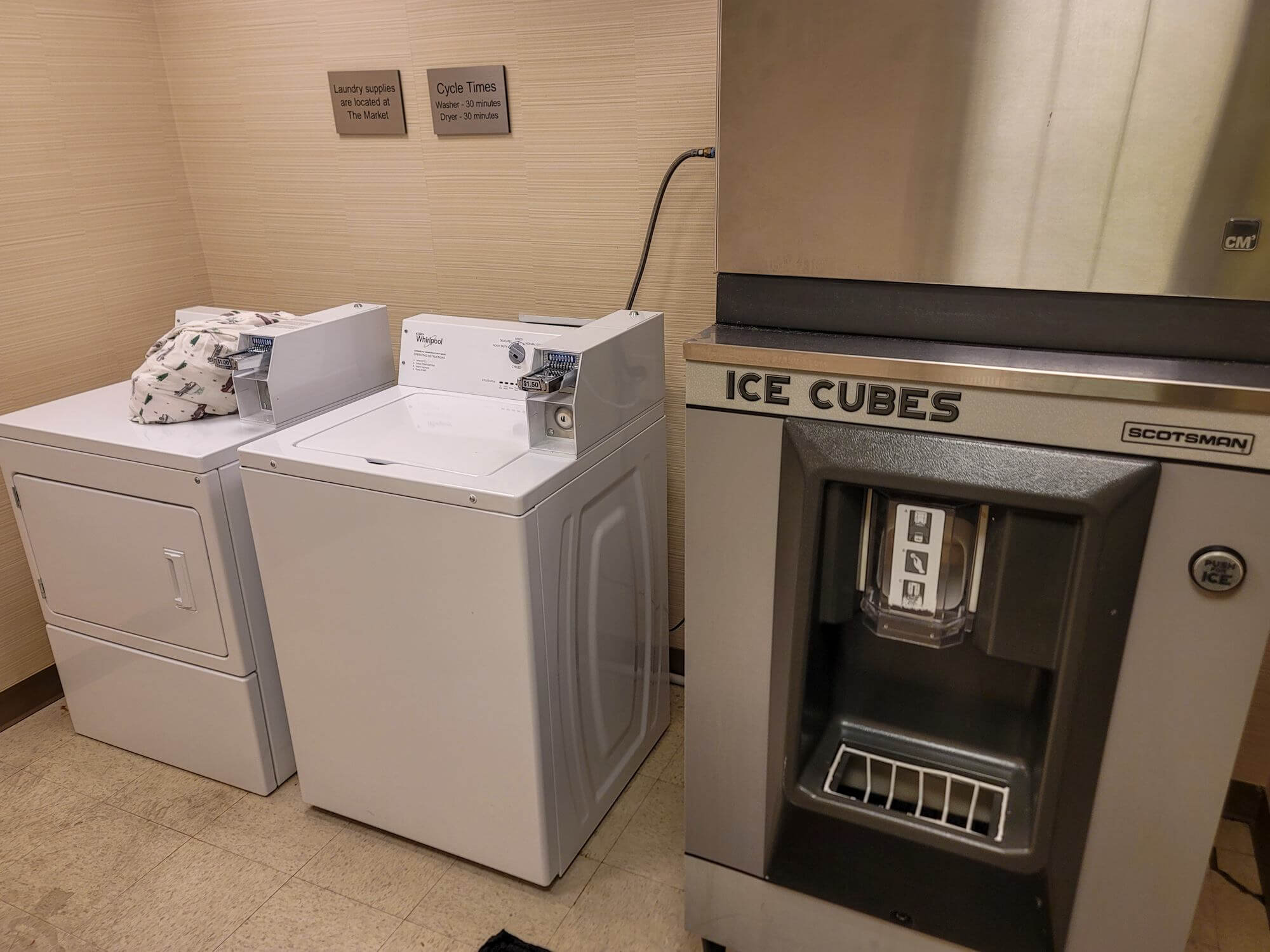 A guest laundry facility is located on the ground level at the end of the left hallway. You need your room key to enter the laundry facility. The washer and dryer are coin operated, and you can get change at the front desk. Inside the guest laundry room is also an ice machine.