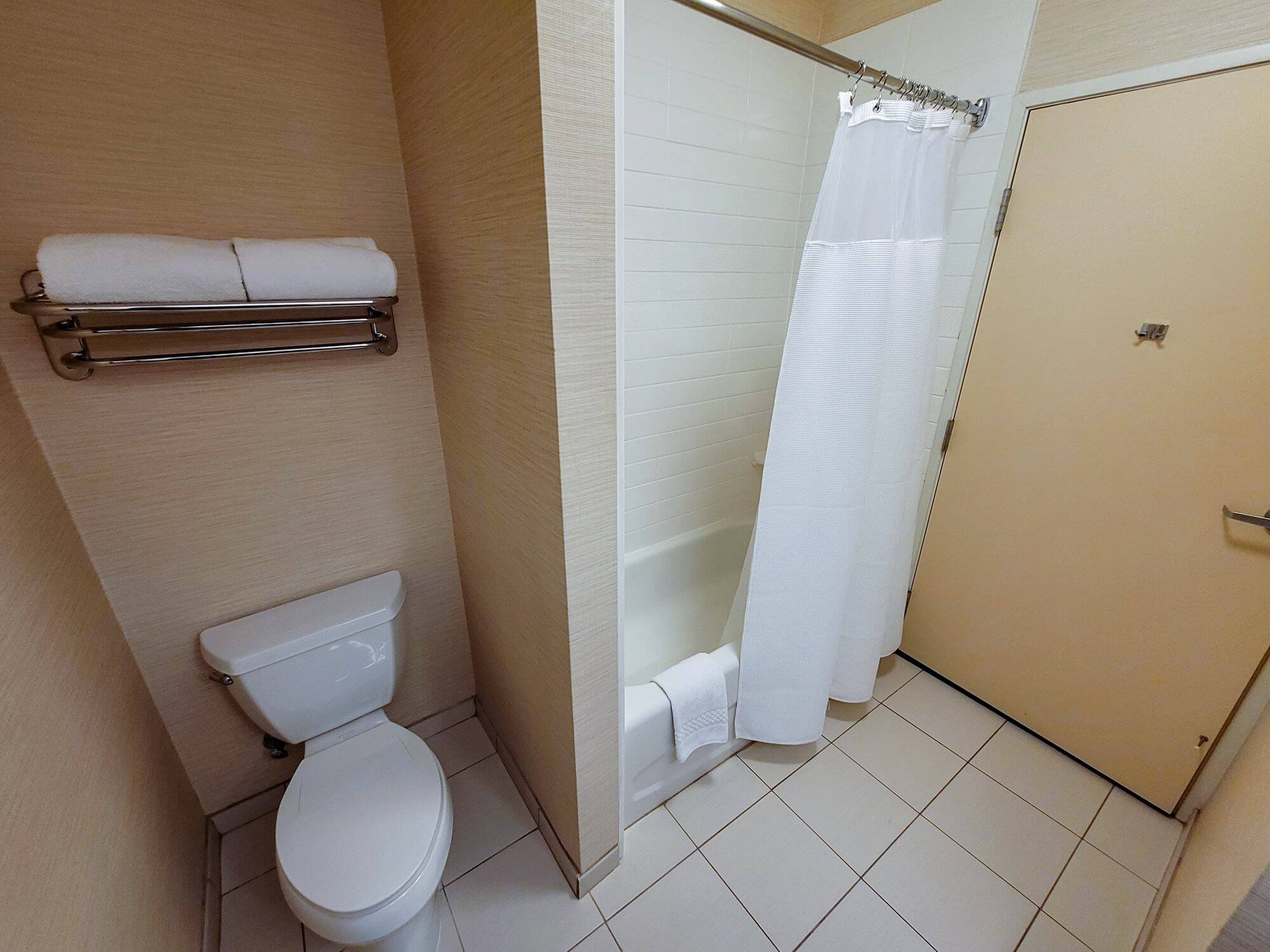As you enter the room you have your bathroom on the right. It comes with a vanity with a single sink and a wall-mounted mirror. A bathtub/shower combo unit is also found in the bathroom. Three wall-mounted dispensers inside the shower area provide soap.