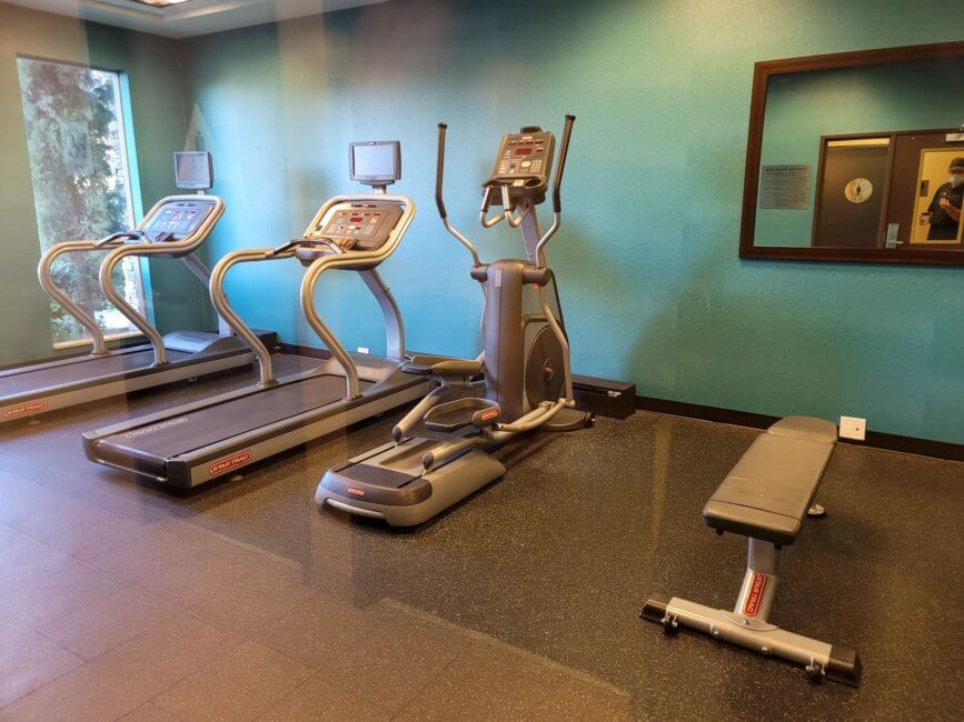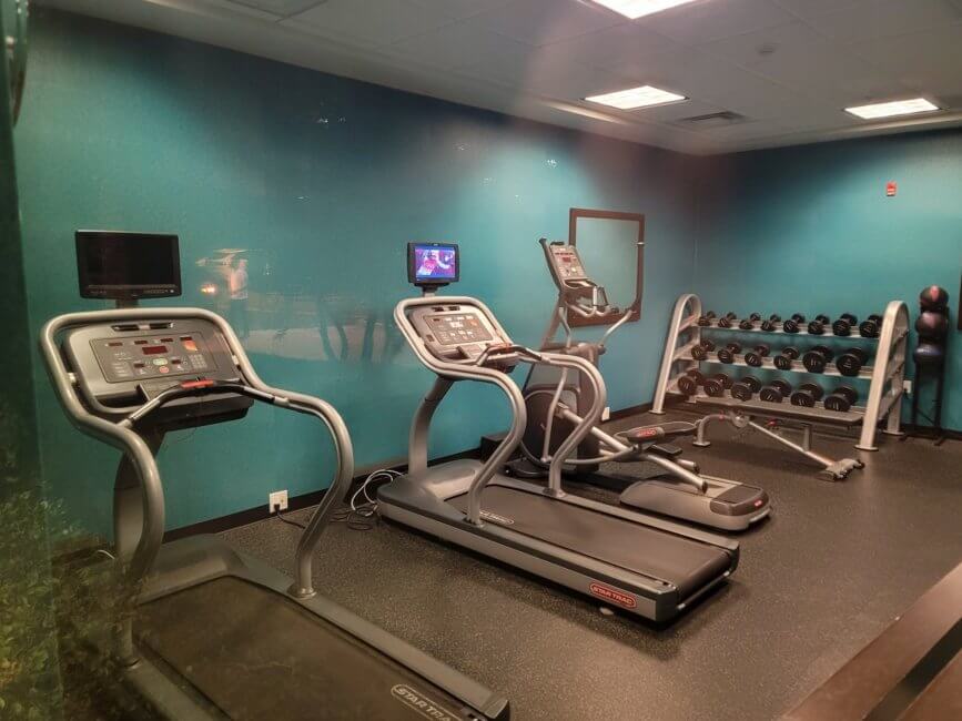 Heading down the right corridor of the central hallway you get access to meeting rooms as well as the fitness center. The fitness center is small and has basic workout equipment. Nothing special. However, you need your room key to access it and with the hotel’s machine being down, I never saw anyone using the fitness center. The window from the fitness center faces out towards the front parking lot. Access to the fitness center is granted 24/7.