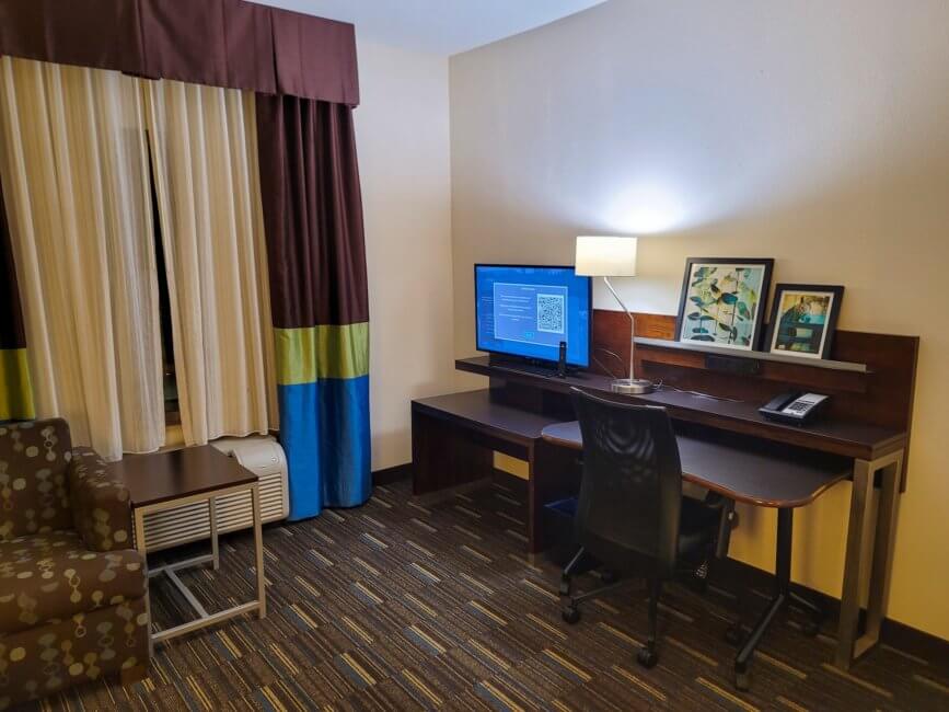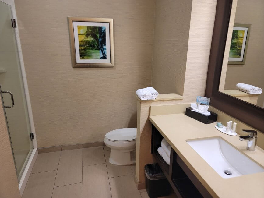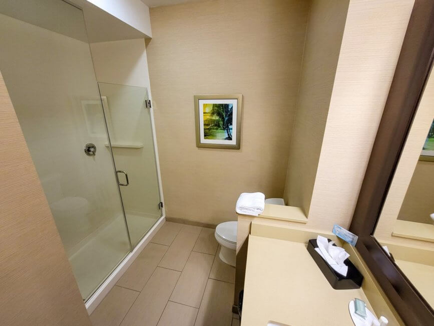 This room is one of the more spacious ones at the Fairfield Inn & Suites by Marriott Riverside Corona/Norco. The bathroom is immediate to the right of the room door. Inside the bathroom, you have the vanity and a single sink on your right. Above it is a large wall-mounted mirror. Next to it is the toilet. On the opposite side of the bathroom is the shower. The shower had a glass door for you to get in and out. Surprisingly this shower didn’t have the wall-mounted dispensers most hotels have now in their shower.