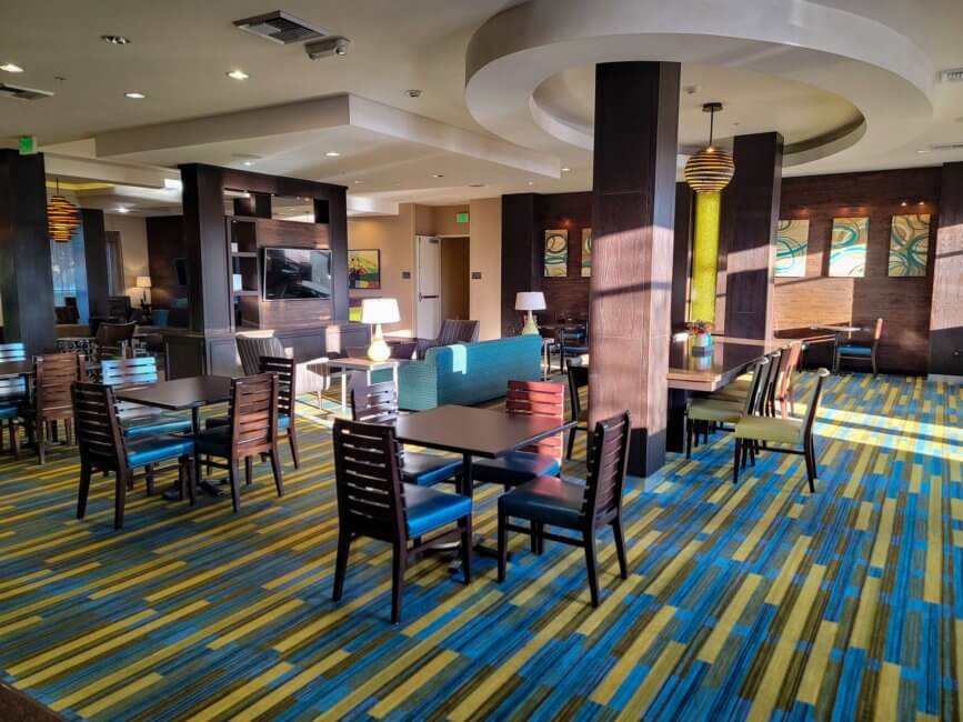Inside the lobby, near the front desk, you find a couple of sofas and chairs to sit down. This takes about half of the depth of the building. Once past the center hallway of the building, you have the breakfast area with even more seating. The seating area is open all day and can be used to meet up with colleagues and set up your laptop to work on stuff.