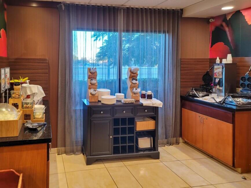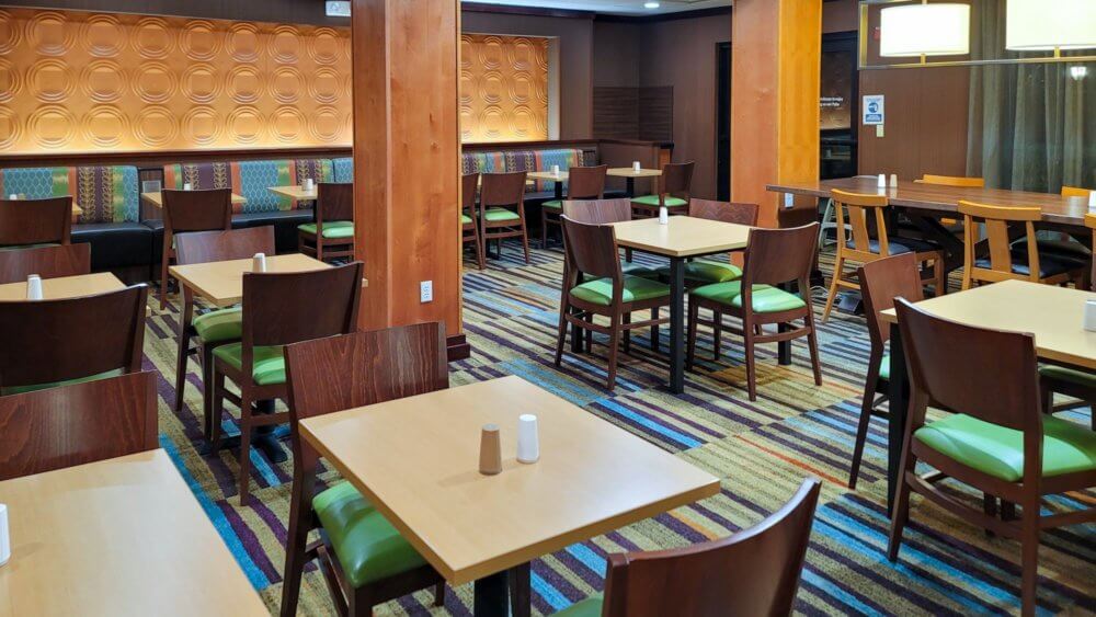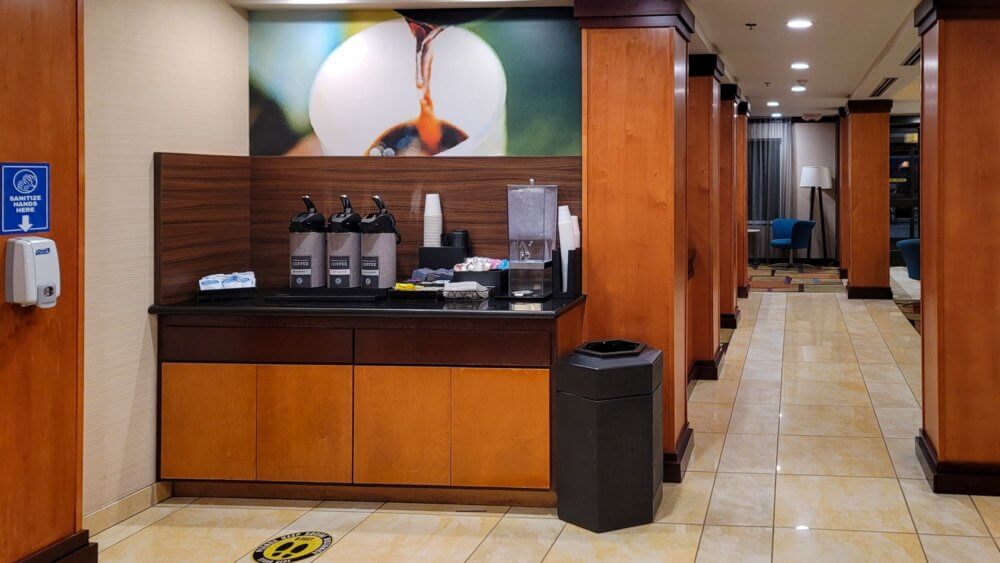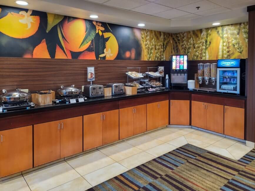 The breakfast was actually pretty good. It was basically a full continental breakfast buffet even tho we are still battling the Covid pandemic. Compared to other hotels, they made an effort to provide a valuable breakfast. Some items are individually packed rather than just being set up for everyone to grab. An example is the plastic dishware, it comes in a small plastic bag rather than being put on display in bins for everyone to pick what they need. The food overall was decent and exactly what you would expect from a Fairfield Inn breakfast buffet. The service was great as well. The staff member on duty kept all the items stocked and continuously wiped all the surfaces and tables after people left.