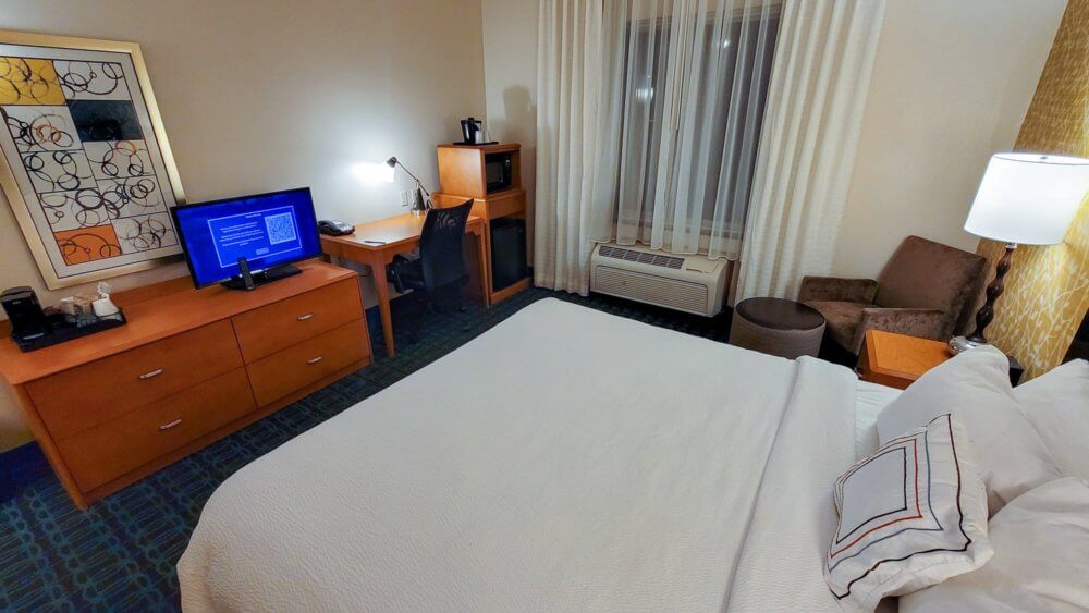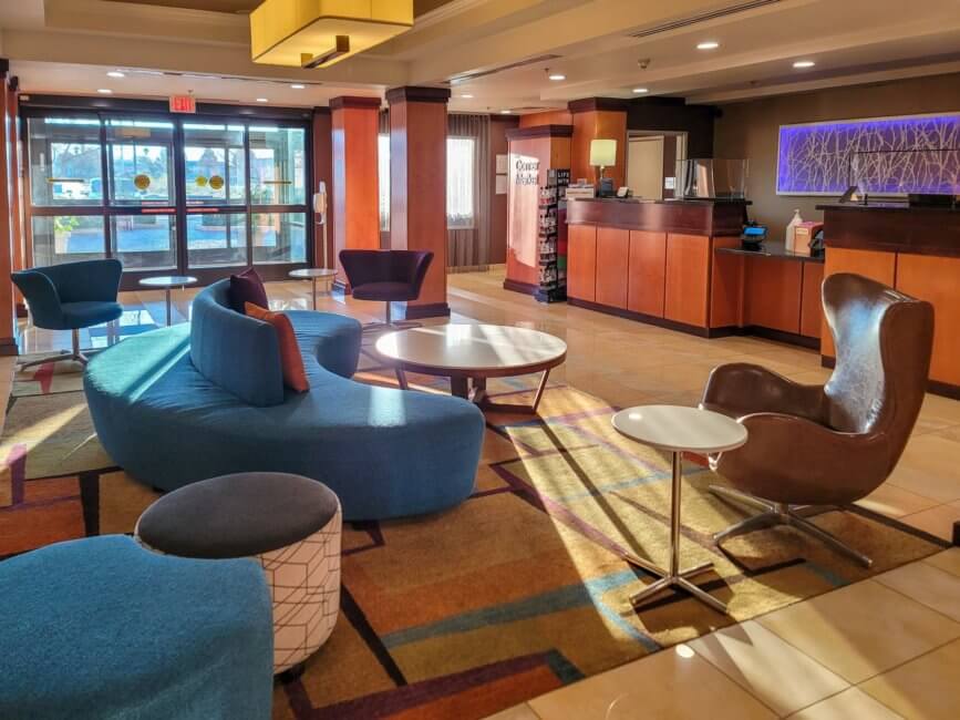 After arriving at the hotel, I parked straight at a parking spot near the main entrance. It was late afternoon and nobody was in line to check in. Overall the whole process took only a few minutes. As usual, I had to show my ID and credit card and received my room keys. As a welcome amenity, I had the choice between a market item or points and I decided on points. Besides that, I also received two water bottles as a loyalty bonus with Marriott. The elevators are down the main hallway to the left. Masks were still required during my stay for all individuals and most people wore masks. Only some guests refused to do so but the hotel staff didn’t do anything to even make them aware of it.