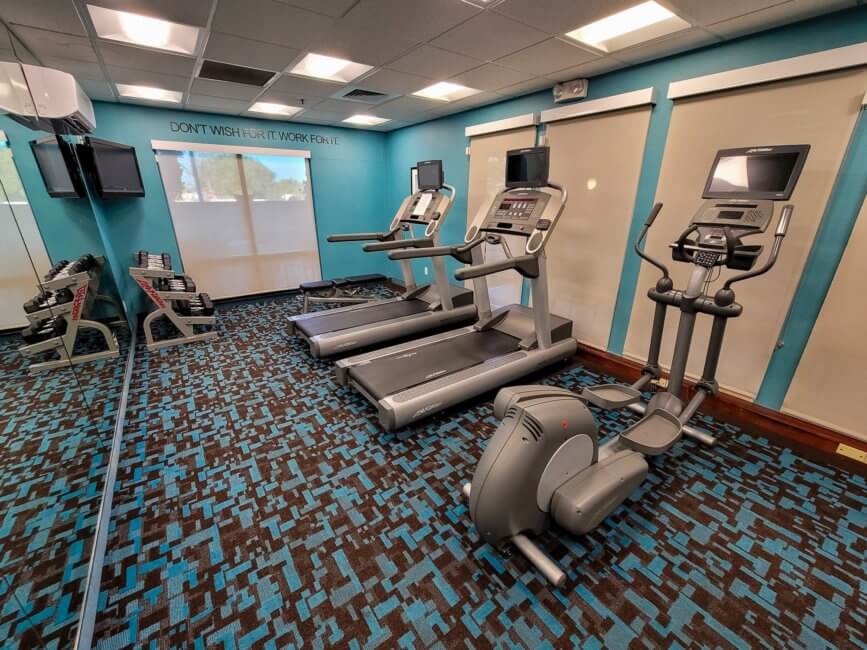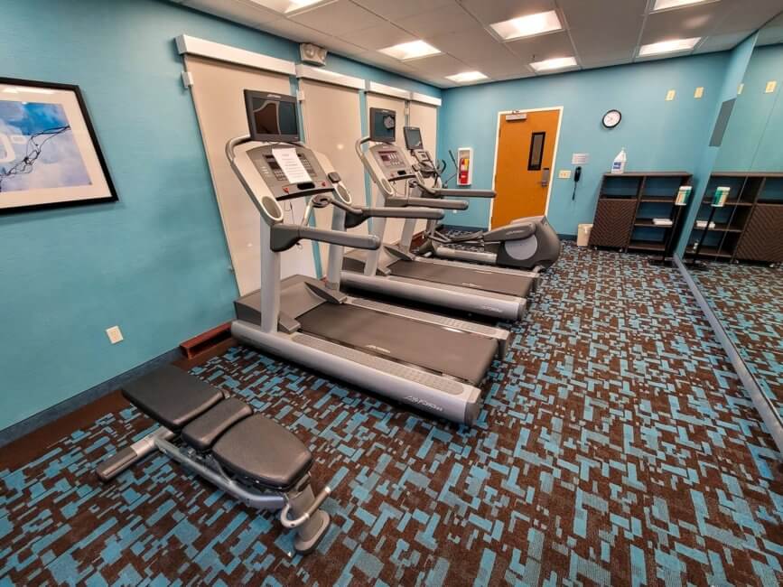 The Fitness Center and Swimming Pool share the same entry door. You get to a small foyer from where you can get to the fitness center or the indoor pool. Both require your room key to enter during normal operation. Because of covid, both are locked and you have to request a key card from the front desk. They will manage how many people are in each area. I never saw any people using the pool. Only the fitness center got used regularly.
