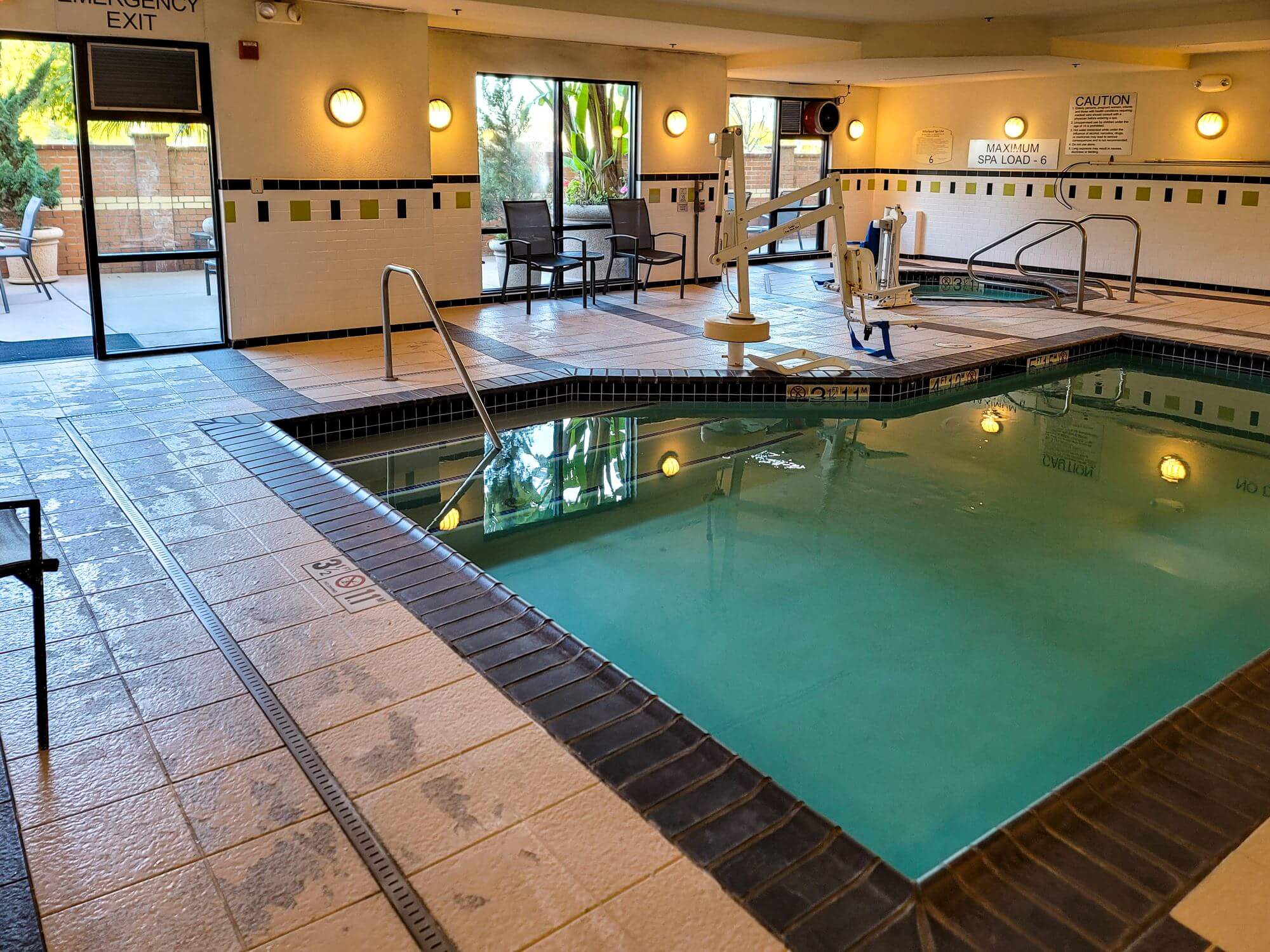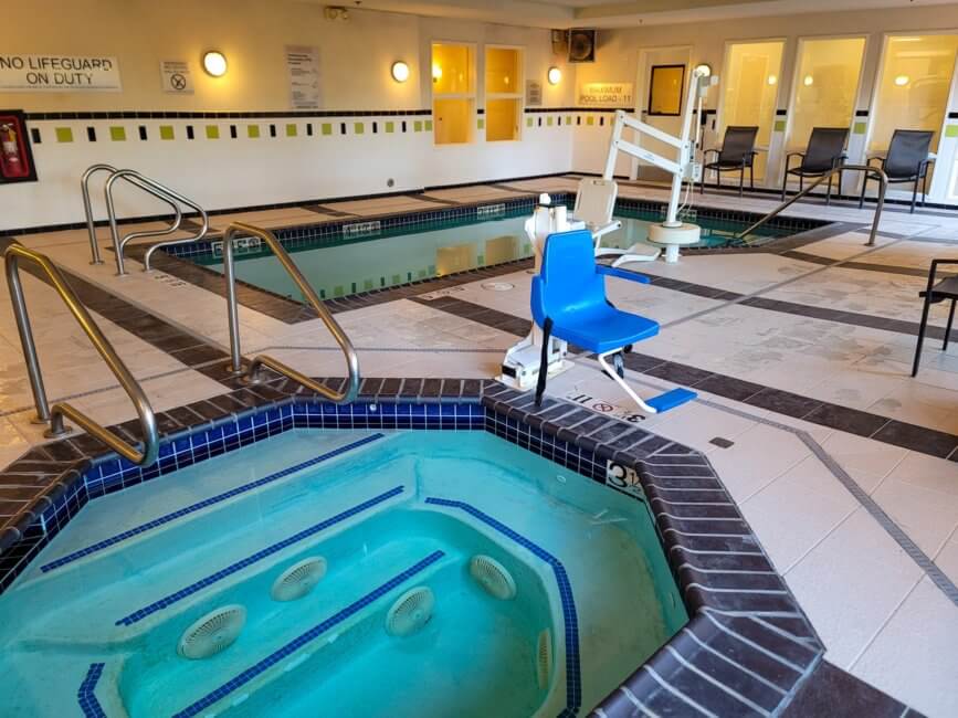 The fitness center is not very big but has all the necessary workout equipment. Pool and whirlpool are both indoors which makes them easy to use throughout the year.