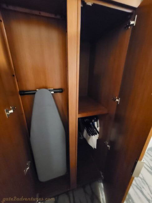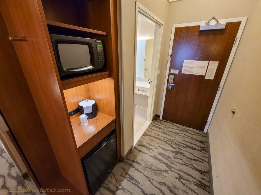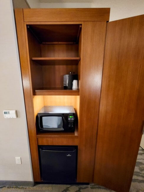 Next to the dresser is a spot to put your suitcase and a dressing mirror. The corner from the bed area to the hallway leading to the room door has a corner closet built-in. It gives you extra space to stow your belongings and also holds a mini-fridge, microwave, and ice bucker. I assume they removed the coffee maker because of COVID-19. In the same corner, next to the bed, is also the AC control.