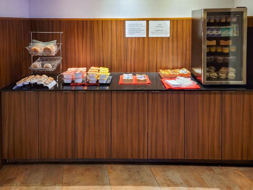 Most of the tables and chairs were removed from the breakfast area. There were some individual tables along the wall to sit down and eat, which also allowed for very good social distancing. As the drive to my job site was pretty long, the grab and go solution was actually convenient as I could just make myself a little to-go package and eat it when I arrive at work and have a minute. This let me sleep in just a bit longer.