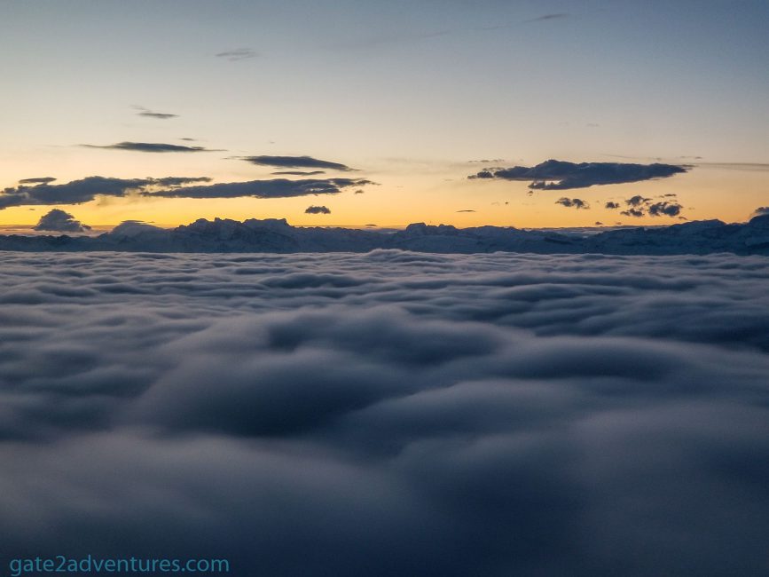We started our descent to the clouds into Zurich. The sun was just rising over Zurich and dawn broke. We started to descend through the clouds but before we even could make it out of the thick cloud layer you could feel the plane speeding up and pulling up again. Shortly after we broke through the clouds again. You could see the Swiss Alps peaking through the clouds. We cycled around and did another approach to land and this time we touched down.