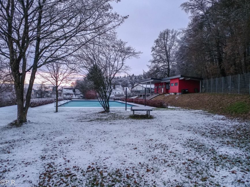 We drove over close to the calculated coordinates of the bonus cache. We decided to park at the end of the town and continue on foot to the cache. This area was the settlement with the living quarters for the people working at the WiFo station in the forest. The swimming pool was built in cooperation with the small town Oberhausen which we passed on our way. I had to snap a picture. The final was also located fairly quick and snow was no issue here.