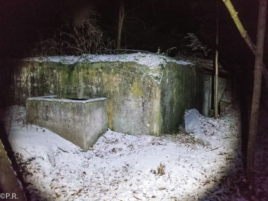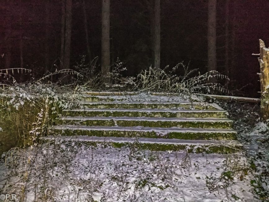 We finished our tour for today. The next day I came back with another friend to finish this tour. We started at the “Secret Laboratory“. We already had issues answering the first question because it snowed during the night. The next station brought us to a huge building and lost place. It looks like a temple in the jungle. Trees started already growing out of the first floor but we explored the basement. There was a courtyard in the middle of the building and a big tree grew out of it. This shows that this place has been given up for a long time already. It took us a lot of time to find hidden information about the next stage. Our UV-light was very weak and small and I didn’t look close enough. After the discovery of the final coordinates, we went off to search the cache box. Here we were luckier by actually finding the box itself before we found the UV marking showing the cache location.