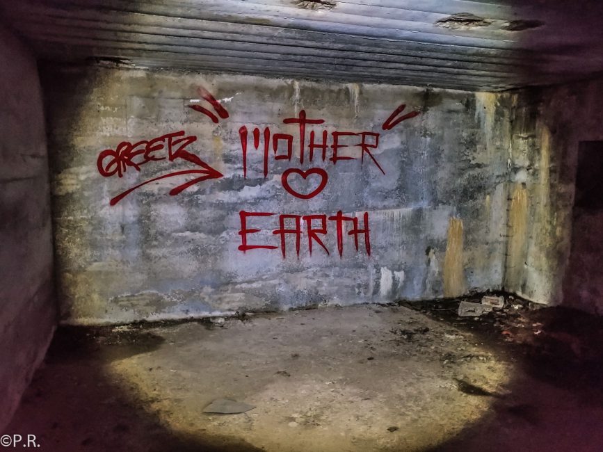 Only the basement (bunker) of the building is still there and easy to access. We had a look through all the rooms and one room had a great graffiti on the wall reading in English “Take your trash back out”. Usually, kids come to places like this, play, and leave trash behind. I was surprised by how clean the actual building was. There was still trash, but compared to another Underground Cache I did a couple of years back, I would consider this one as “clean”. After spending some time here, we were able to answer the questions and find the cache location.