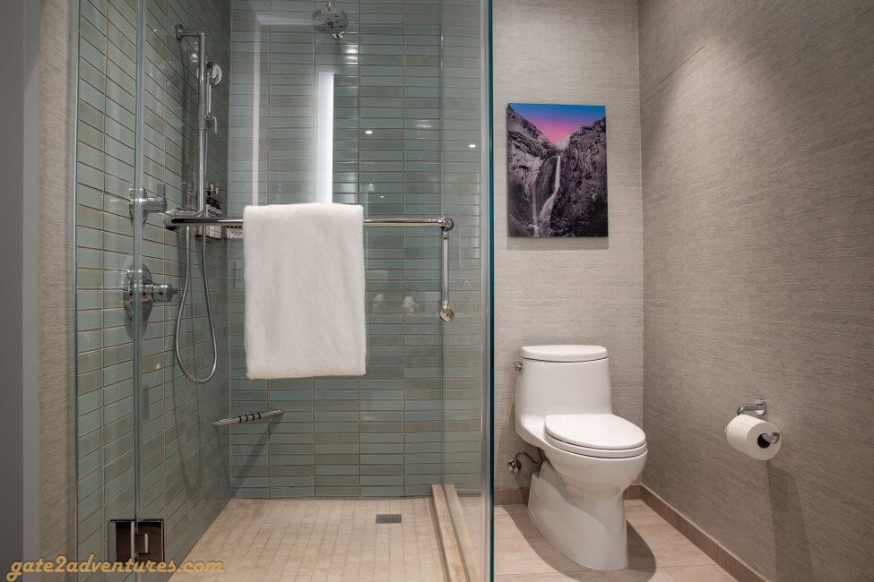 Opposite the closet is the entrance to the bathroom which can be closed with a sliding door. Inside is a beautiful shower with an overhead showerhead and removable shower head inside a glass “box”. Next to it is the toilet and opposite of it is the vanity with a big edge-lit mirror. Next to the vanity is a dressing mirror mounted to the wall. Inside you find all the typical amenities you expect like a makeup mirror, hairdryer, makeup remover, and even a scale.