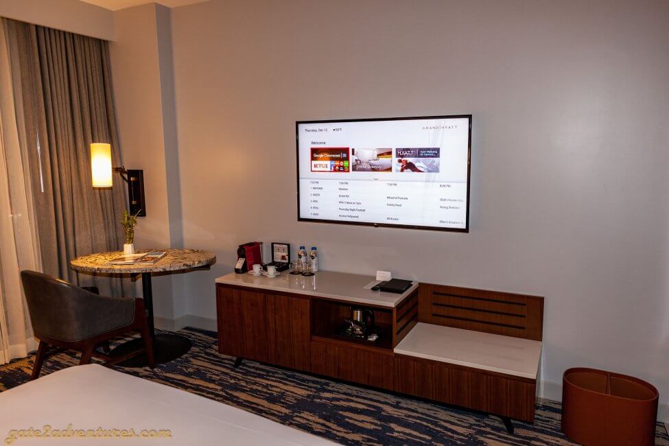 In the one corner of the room, next to the window, is a desk and chair while in the other corner you find a chair with a footrest. Next to the desk is a wall-mounted TV and below a closet that hides a small refrigerator and safe besides some empty drawers for storage. On top, you find a coffee maker and aluminum water bottles. Of course, this hotel offers also Chromecast integration with the TV in your room. This is one of my favorite benefits of Hyatt. Other places let you sign in to your own streaming accounts, but just streaming it from your phone or tablet is way more convenient. Besides that, you can use any other app which is compatible with Chromecast.