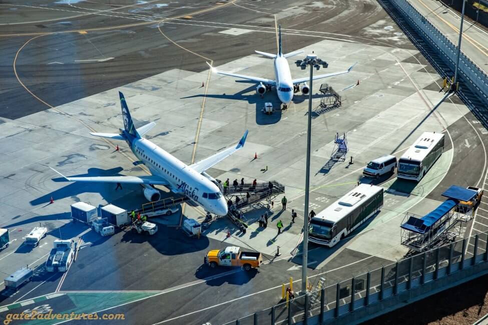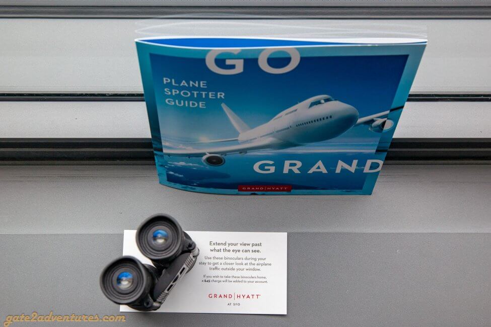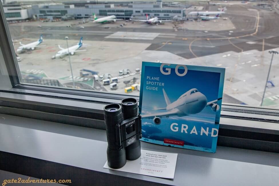 A nice little extra is the binoculars (16×32) and a plane spotting guide. The binoculars are really great to see what’s going on at the airport. Please don’t try to take the binoculars or the guide with you, so other guests can enjoy them as well and you avoid getting charged $45 for the binoculars. The plane spotting guide gives a simple reference to the planes you commonly see here, but it’s missing a lot of the smaller planes you can see at the nearby gates as well.