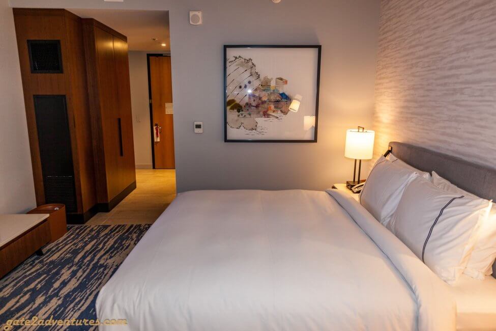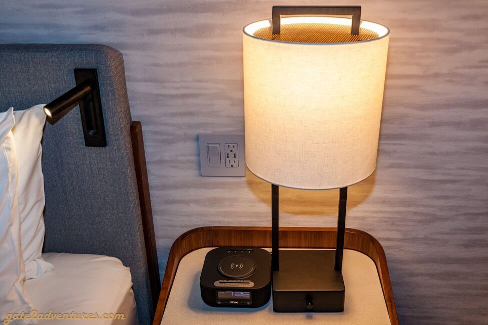 Just opposite the TV and closet is the king-sized bed. It sits centered against the wall and comes with a nightstand on either side. Both sides of the bed have a light and a reading light mounted to the headboard. Two power outlets and two USB ports are conveniently located on either side of the bed to charge your devices. I really loved the alarm clock on the nightstand from iHome. This clock had a built-in wireless charging platform on top of it and if you have a compatible phone, this is just awesome.