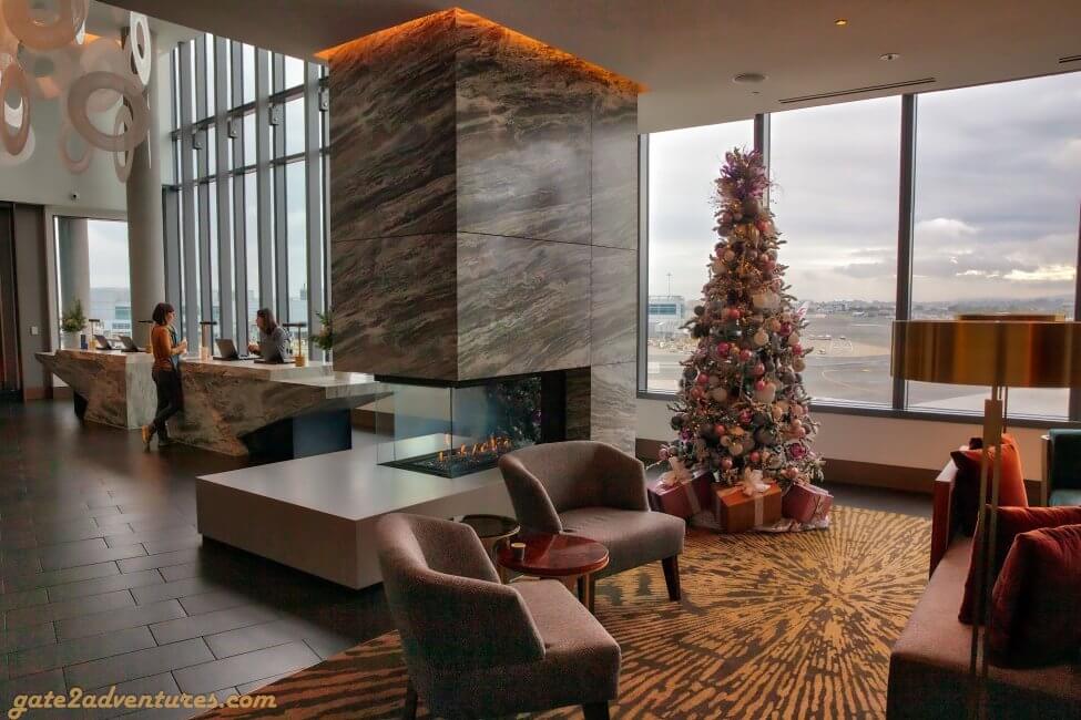 The hotel has a lot of spaces to hang out. There is a beautiful lobby space on the fourth floor just past the front desk and next to the bar and market. Plenty of chairs and also some tables where you could set up your laptop. Lots of them with great views of the airport as well. There is a small fireplace next to the front desk. On the hallway connecting the lobby and the AirTrain station is a bucket with umbrellas, which you can borrow for free.