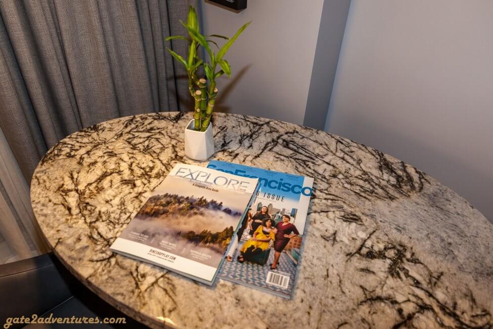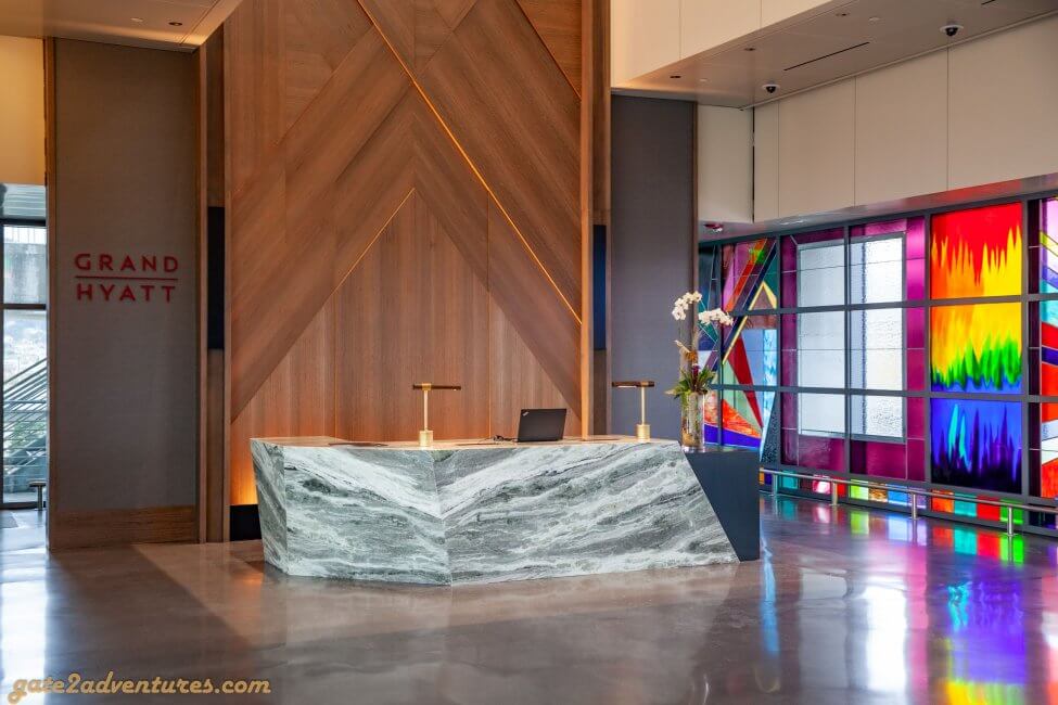 After I arrived at the Grand Hyatt at SFO’s Airtrain station, I took the elevator down to the connector to the hotel. There is even a check-in counter right in the Airtrain station, which wasn’t manned anymore during my time of arrival. I walked straight over to the hotel where you will find the check-in counter right in front of you. This is actually the fourth floor and if you arrive by car, you have to take the elevator up to this level to check-in. I really liked the marble countertops at the front desk. This gives the place an extra luxurious touch.