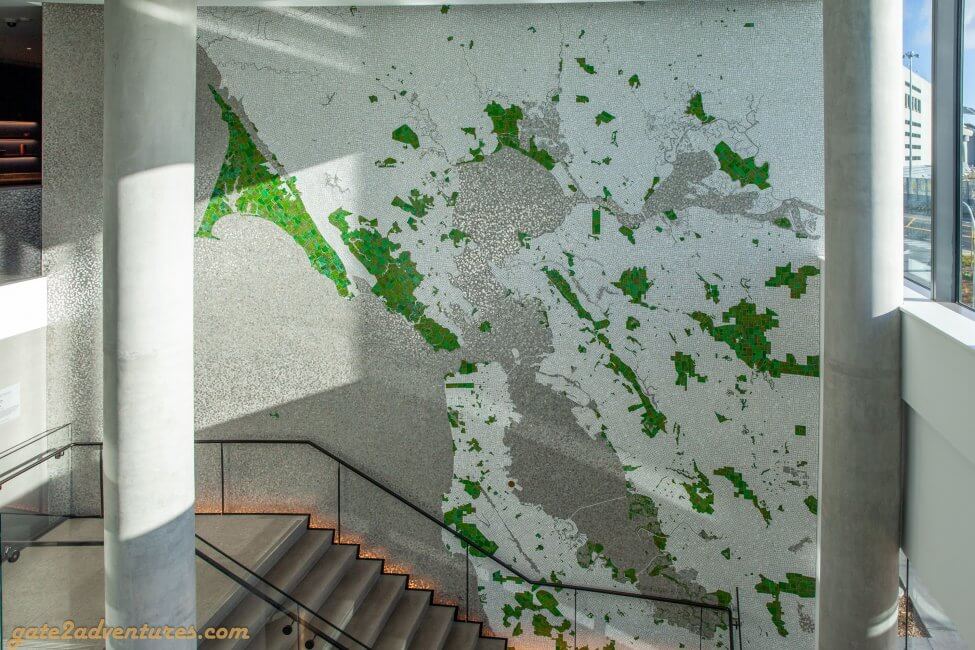 On the second floor, you find all the meeting rooms. It might be worth taking a stroll through the hallways to look at the art pieces on the wall. One of the best art pieces is the mosaic in the atrium between the first and second floors. It shows the Bay Area in a beautiful mosaic. Can you find where you are? Yes, it’s the golden dot on the map. The first and second floors are also connected by a staircase beside the elevator.
