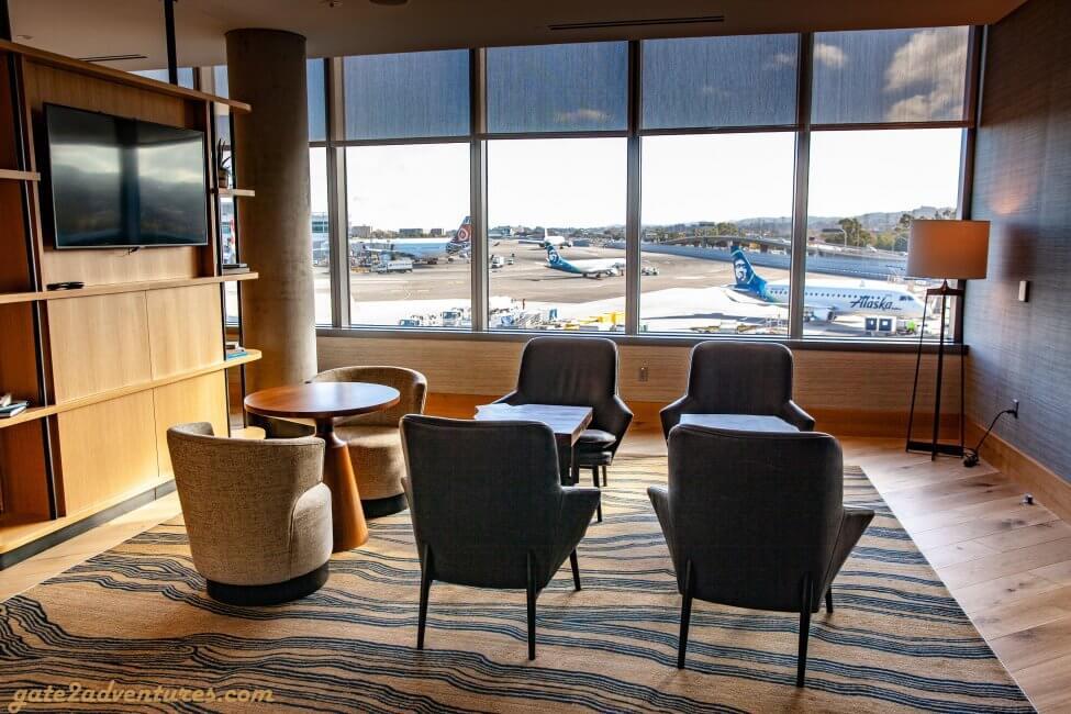 The club itself is beautiful and well designed and located in the corner of the building. This gives you even better views from the windows onto the tarmac of the nearby International Terminal. You won’t be able to see the runways as you are to low. On the shelves inside the Grand Club are many interesting books about aviation and San Francisco. If you have club access come here and grab a book while watching the airport. One of the shelves had different kinds of games for you to use. Ideal if you have to entertain young kids.