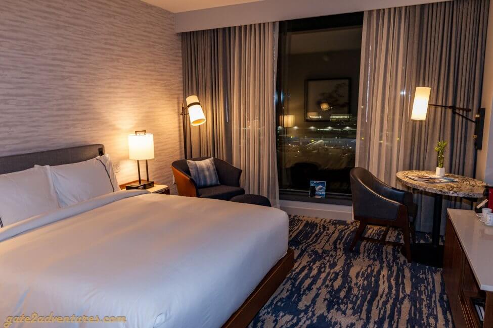 This is a standard room but has an awesome view of the tarmac and the runways in the distance – a dream for plane spotters and aviation geeks. The near floor-to-ceiling windows give you outstanding views of what’s going on at the airport. You can see some of the big international carriers parking at the gate here. Don’t worry the windows have superb noise cancellation and you don’t hear a thing. They are so good insulated, you can’t even hear the planes taxing to and from the gates. So if you have a light sleep, you don’t need to worry about that.