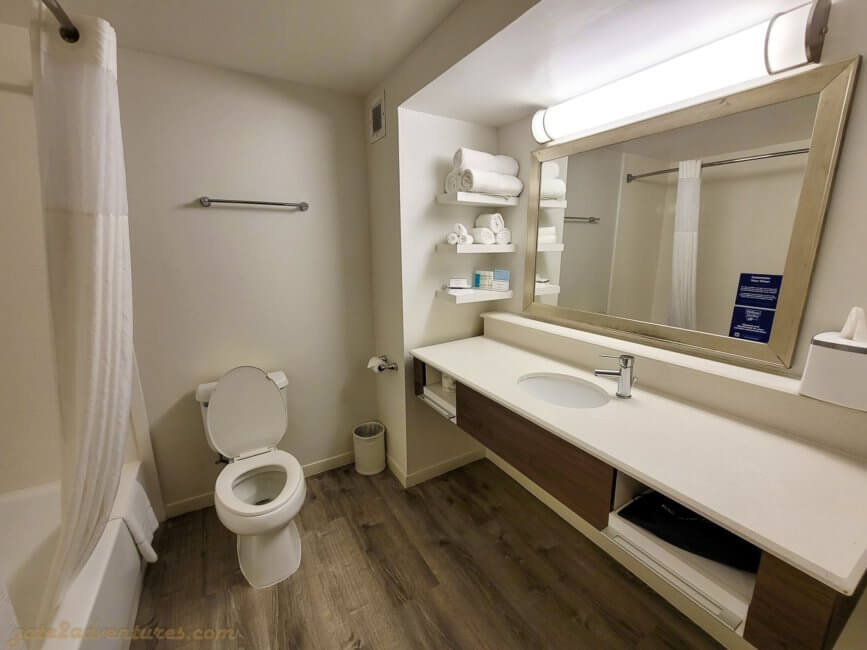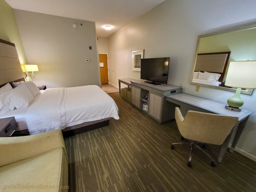 My room was just down the hallway on the left side, past the elevator. This hotel features Hilton’s touchless keys or you can use the Digital Key through the Hilton app. The door also had the “Clean Stay” seal on the door, indicating that the room was thoroughly cleaned. The room has a decent size. When you walk in you have a tiled floor before it transitions over to carpet around the rest of the room. The bathroom is to the right as you walk in. It features a shower-bath combination and a big vanity with one sink. Stickers on the mirror indicate that the whole room has been disinfected for your safety.