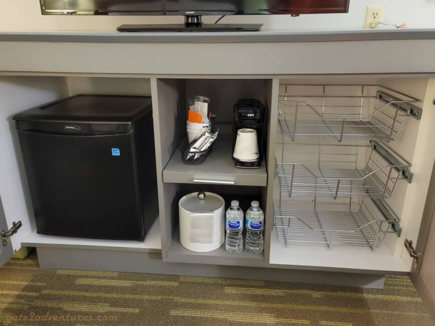 The rest of the room features a king-sized bed with a nightstand and lamps on either side. Next to the bed, in the corner of the room is a sofabed which sleeps, additional guests. Opposite of the bed is a 50″ flatscreen TV on a closet. The closet also holds a mini-fridge, coffee maker, ice bucket, and extra storage space. Interesting is that the website mentions the screen-size of the TV to be 32″ and 49″ on their website. However, Samsung specs show it is a 50″ screen. Just something I noticed. The TV remote was wrapped in a clear plastic bag, which looks like one of the small garbage bags they use as well in the rooms.