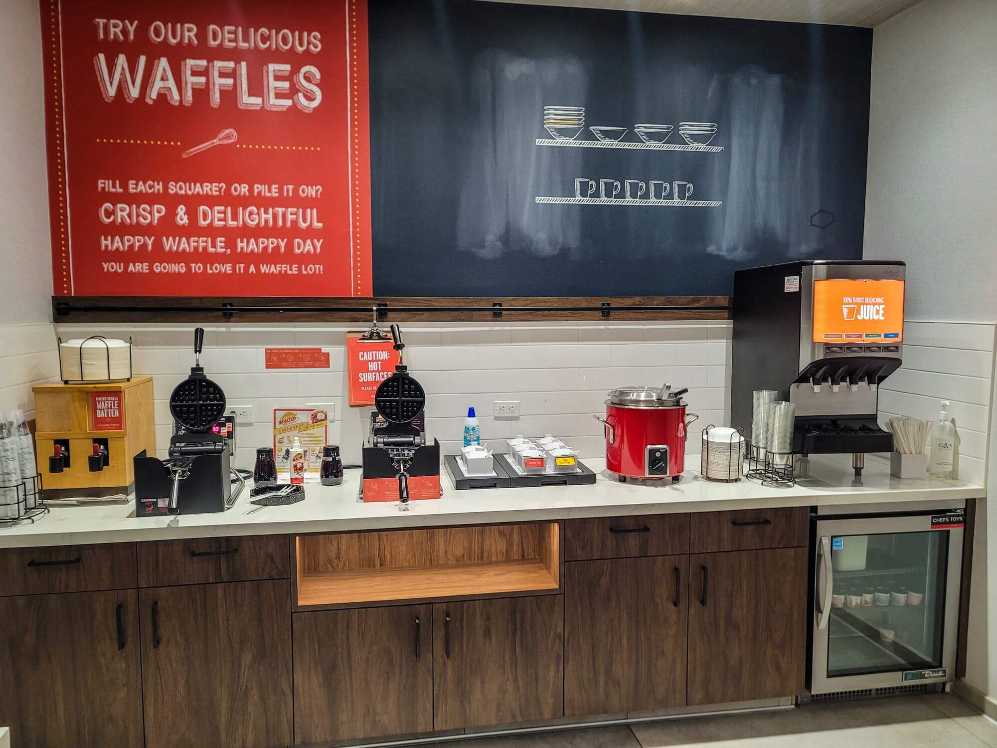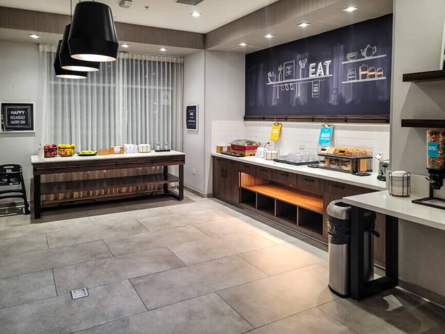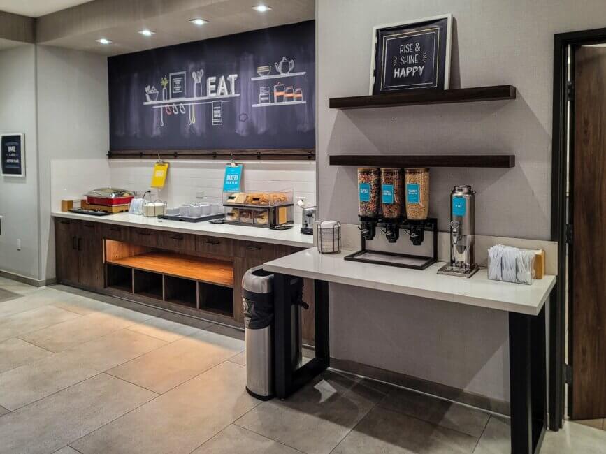 The Hampton Inn & Suites El Cajon San Diego offers a standard continental breakfast but with lots of choices I don’t like. They have cereals but none of the standard cereals you would expect. I almost never saw anybody getting cereals. The hot options are usually some kinds of eggs and meat. They change throughout the week, which is actually nice. The staff members on breakfast duty were always watching to make sure everything gets restocked timely. The breakfast buffet is set up in a separate area of the lobby, which is closed off after breakfast hours.