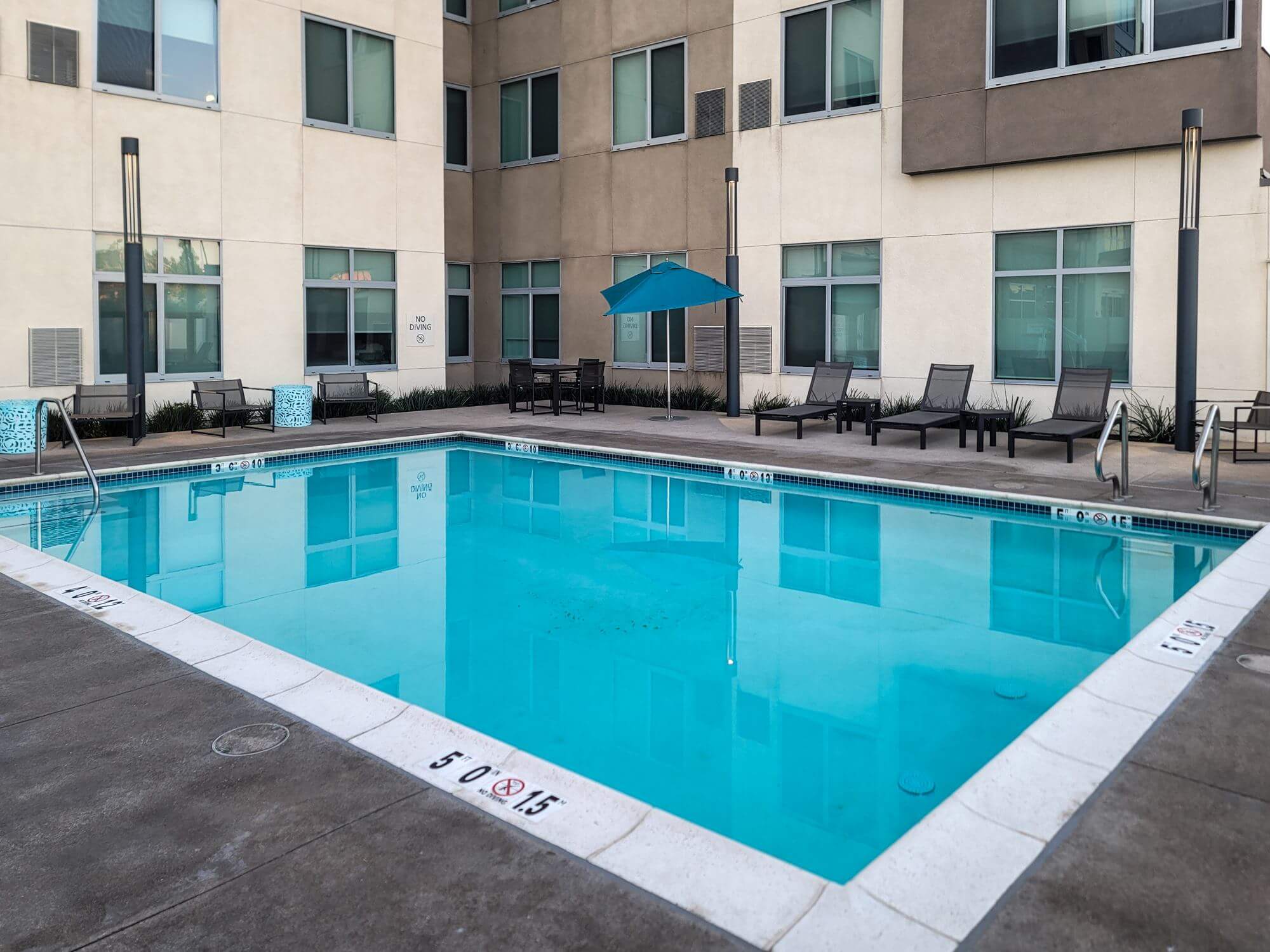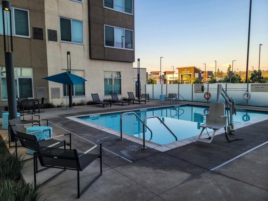 The hotel has an outdoor heated pool. To access the pool area, you need your room key. There are a few pool loungers in the pool area. Unfortunately, the pool area is at the front of the building, where it can get busy because of the drive-through line being right outside of the pool area.