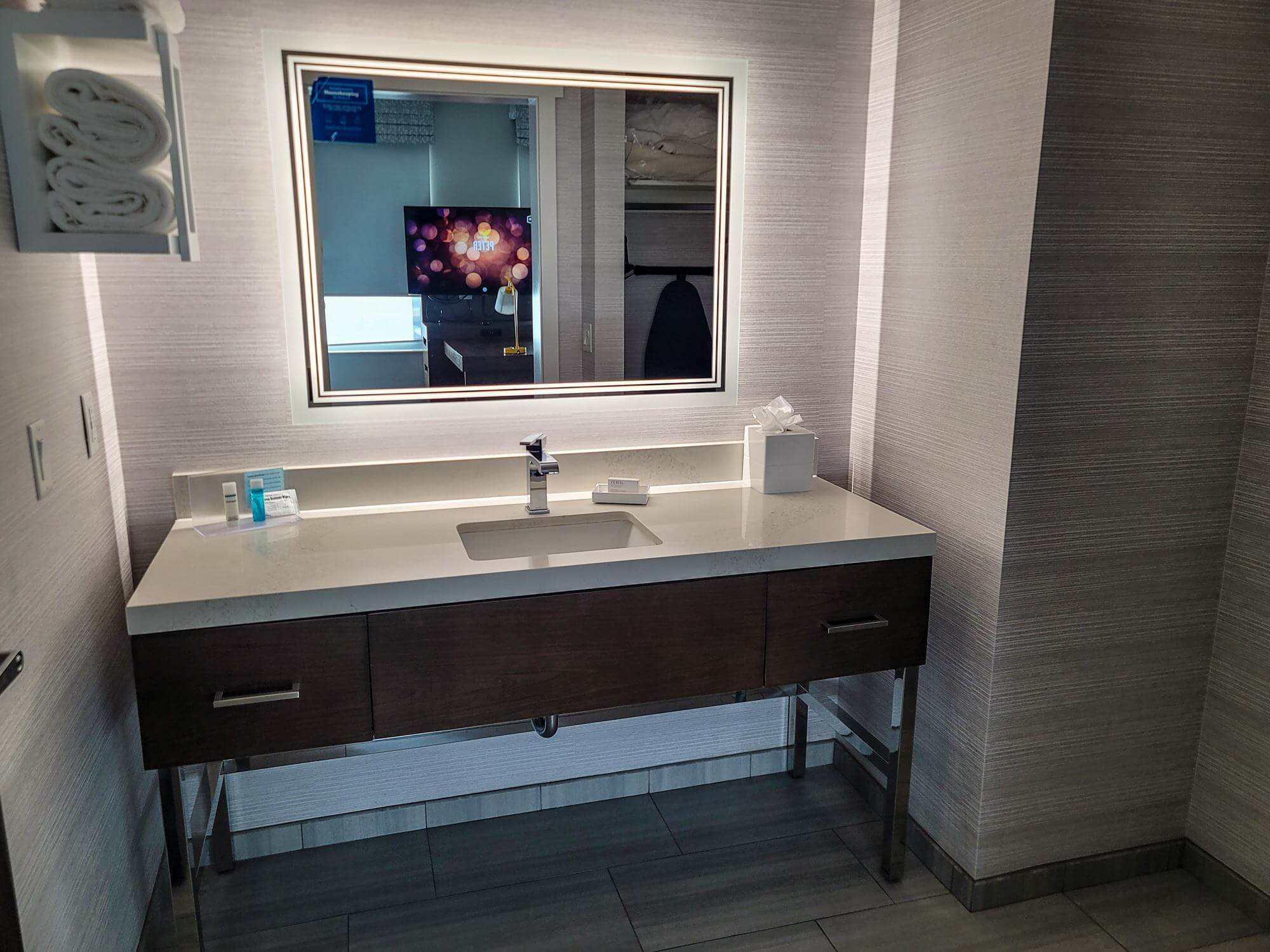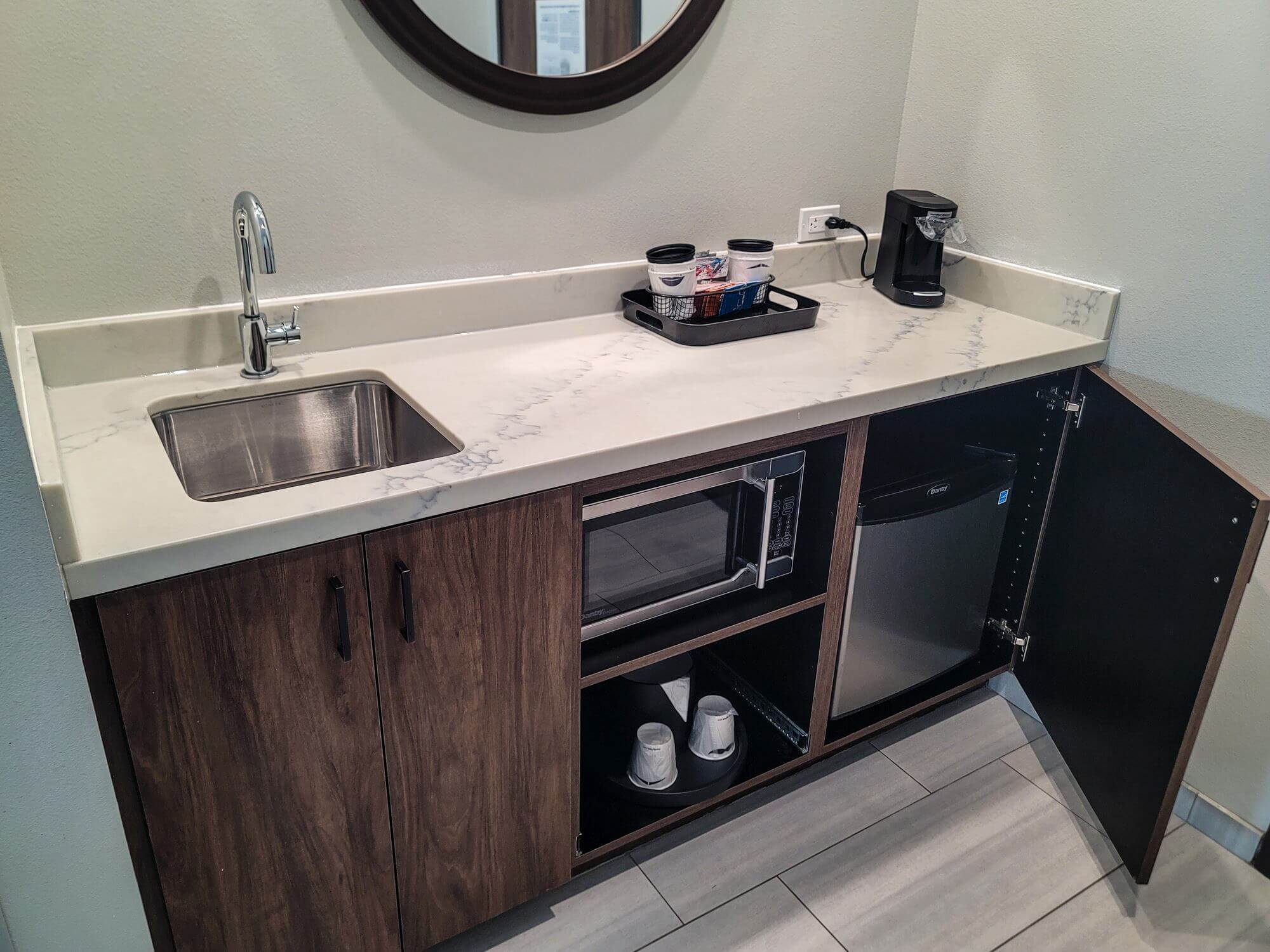 As you walk into the suite you have a counter on your right which houses a fridge as well as a sink. I don’t know why many suites have a sink but no actual kitchen. No utensils and no dishware. On a shelf in the counter is a microwave.