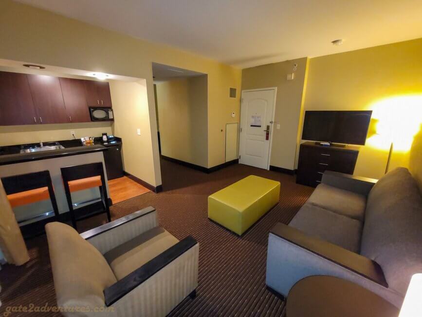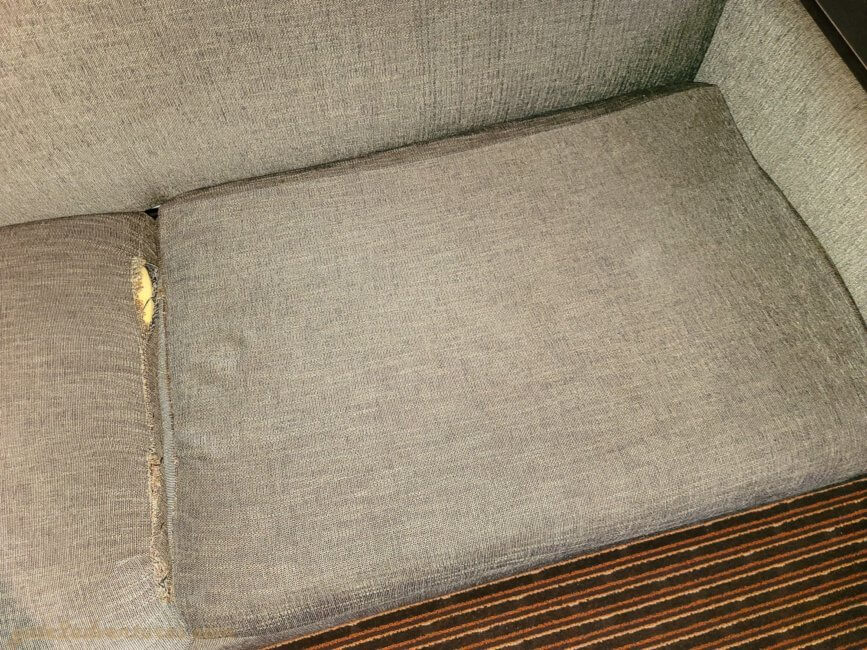 When you first walk into the suite you have the living area right in front of you. It has a sofa and sofa chair with a footrest in front of both. Next to the room door is a closet with the TV. Only the sofa chair faces straight towards the TV, the sofa itself is 90° off to the side. On top of the closet was the TV remote which was supposedly sanitized as it had a sticker wrapped around it with the “CleanStay” label. Right next to the TV remote were three sanitizing wipes. If you want to be safe and want to wipe down the room, you need a lot more than three. The sofa was old and worn out. One of the cushions was even torn and the foam was coming out. This is pretty sad for one of the best rooms in this hotel. This area has one window which doesn’t bring a lot of light into the room because there is a gigantic steel structure outside to support the whole building. The Hampton Inn & Suites Ogden has a U-shape form and my room was facing south.