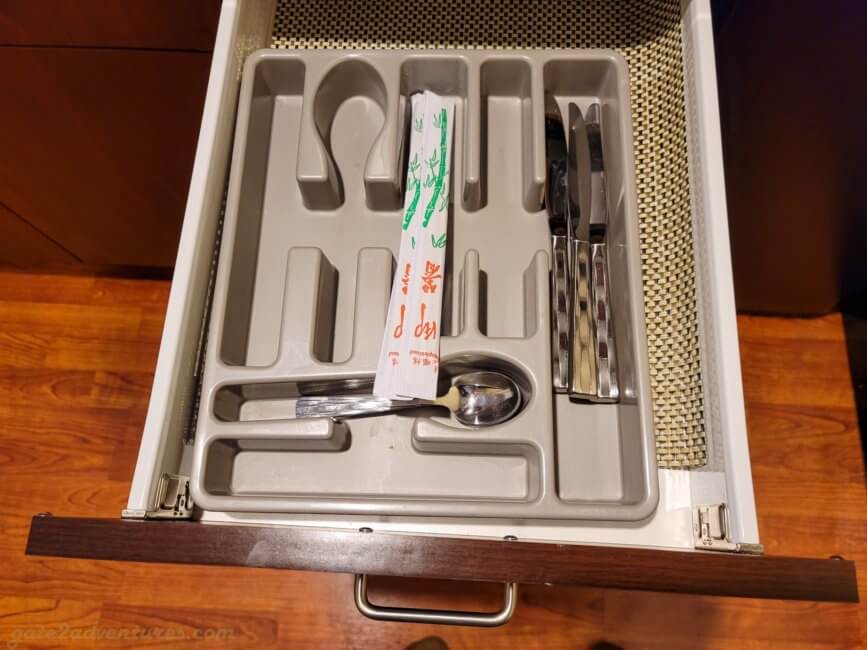 From the living area, you can access the kitchenette, which has a dining counter and two bar stools. I expected more from the kitchenette at first glimpse. Once I started looking closer it was really just a kitchenette. There is only a microwave and coffee maker but no toaster (you might be able to borrow one from the front desk) nor a stove or oven. I also missed a dishwasher but that wouldn’t be that important compared to dishwashing detergent to at least clean the dishes in the relatively big kitchen sink. No kitchen towels were provided either but the shocker was when I started to check the cabinets. As there were enough plates for at least two people and to prepare some food, the utensils drawer was half empty. No forks or spoons, just knives, and teaspoons, and two sets of chopsticks. That’s pretty bad.