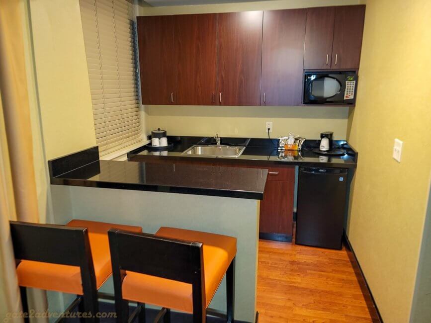 It looks like the whole kitchenette area is just more for show. At least the refrigerator had a decent size and you could store lots of food and drinks inside. One plus overall. But way smaller than what I see for example in Hyatt Houses. Overall I would say, this room was not intended to be used for long-term stays where you would do some of your own meals.