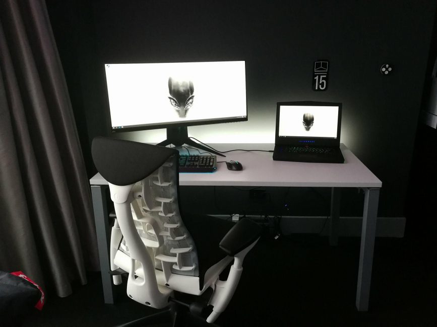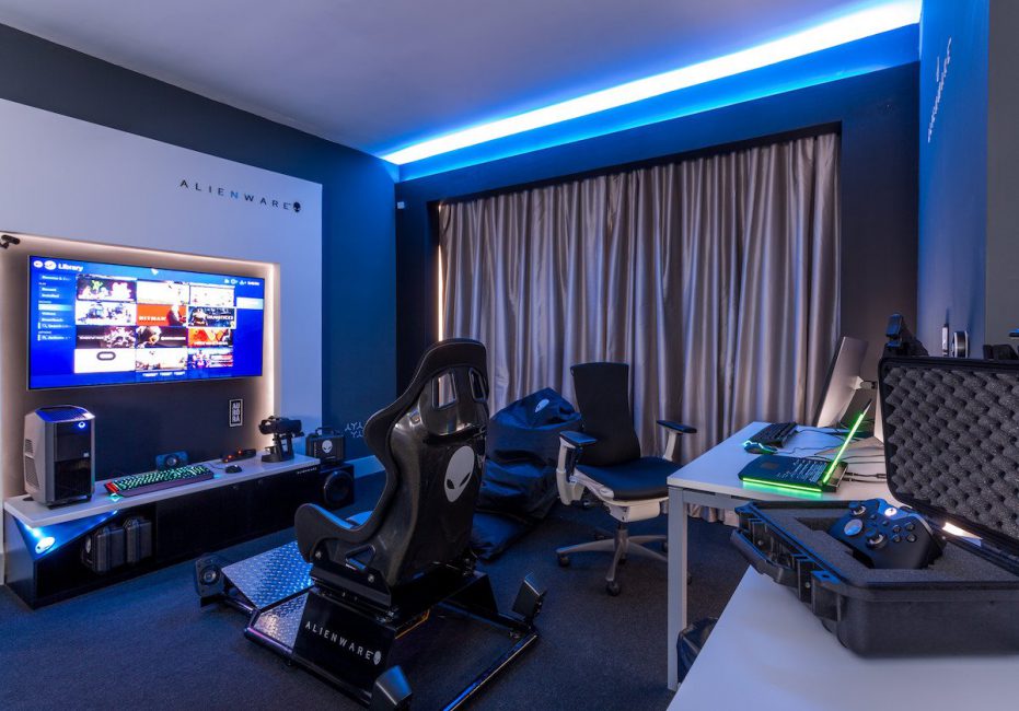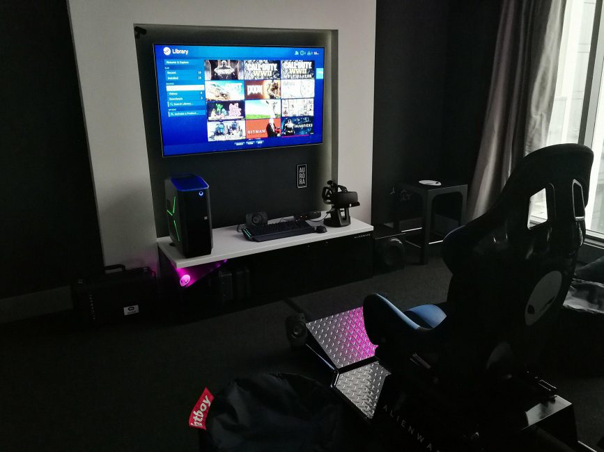 You will find a 65-inch 4K OLED TV, an Alienware PC, Alienware Laptop hooked up to a 34-inch ultrawide monitor, Oculus Rift, Racing Chair and Alienware Gaming Peripherals all over the room. Besides that, you will see the Alienware Logo and Name all over the place in the room.