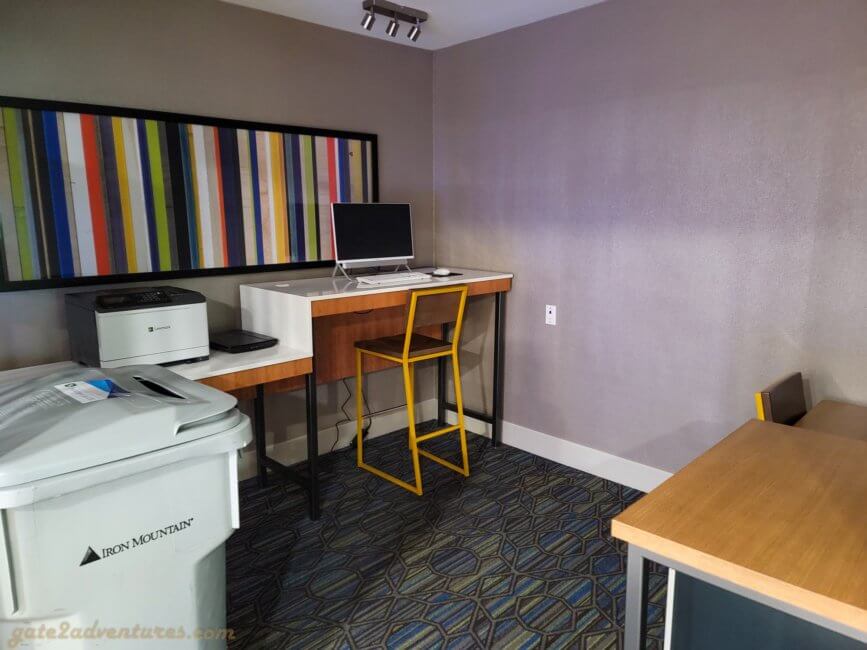 Inside the lobby space is also the business center. Its located in the corner of the room and is separated partially by a small wall. There is no door separating the business center from the rest of the lobby. Inside you find one desk with a workstation and one empty desk. There is also a printer and a giant trash can.