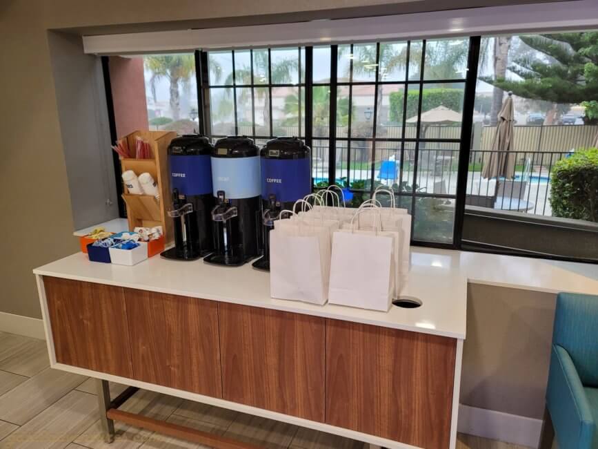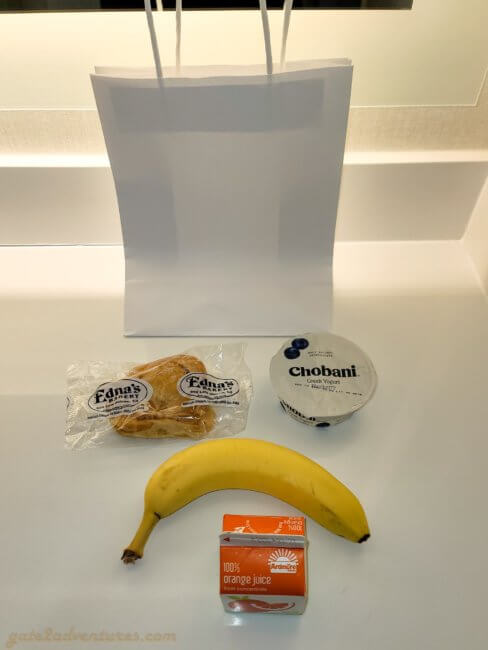 Well, there is not much to say about dining here. Breakfast is a cheap to-go bag. Inside is a pastry from a local bakery, a small box of orange juice, a banana and yogurt with no spoon. I don’t know how they think we would eat the yogurt as there is no silverware either in the rooms. The breakfast bags are set up on the coffee stand, where you also grab your coffee. Coffee is supposed to be available 24 hours a day according to the flyer they hand you when checking in. Coffee is now only available during breakfast hours. Other than that, you can grab some items from the not-so-well-stocked market, as mentioned earlier.