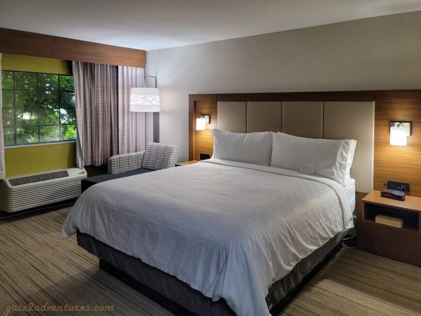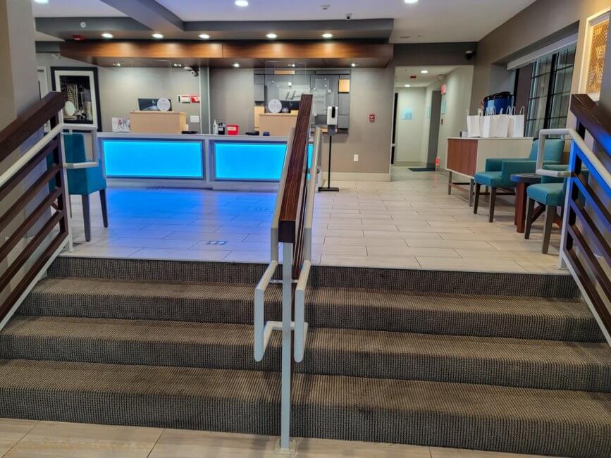 I arrived around 6 p.m. at the hotel and parked in front of the main entrance. Once inside you have to walk up a few stairs to get to the front desk. There is also an ADA/compliant ramp just to the left of the main entrance. Check-in was quick and easy. I asked if they could change my room from one with two Queen beds to a room with one King bed and it was no problem to get that changed. When I booked earlier today, they only showed rooms with 2 Queen beds and a Standard room available. No more availability for a King Bed Room. Maybe someone canceled, I was just happy that I got it. The bedroom with two Queen beds had actually the cheapest rate during the time of booking.