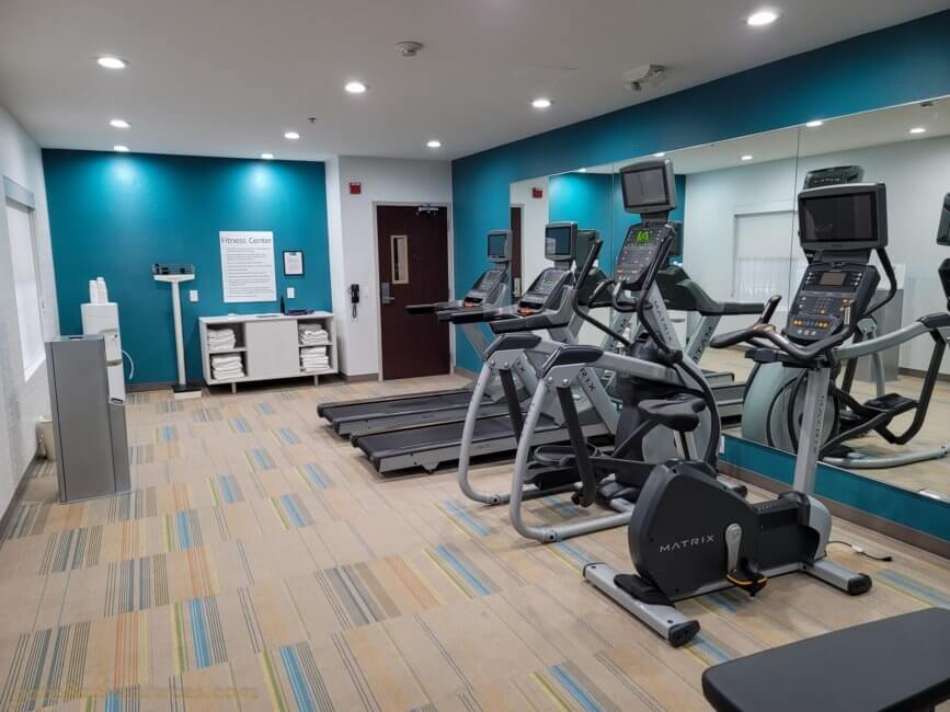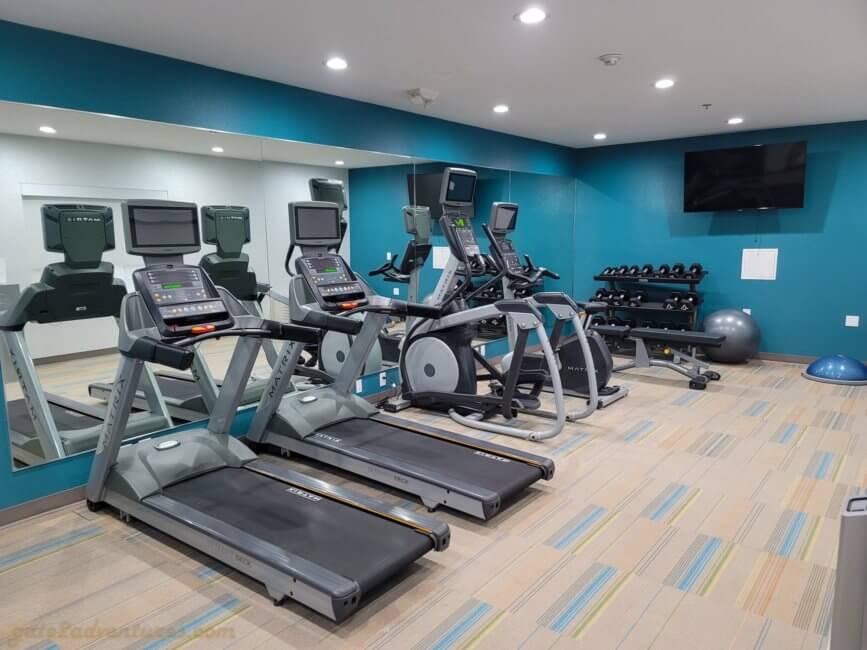 The fitness center at this property is located in the building behind the lobby. It is Building C. It houses the fitness center and a conference room as well as restrooms. The fitness center has a good selection of workout equipment. Here you need also your room key to get into the building.