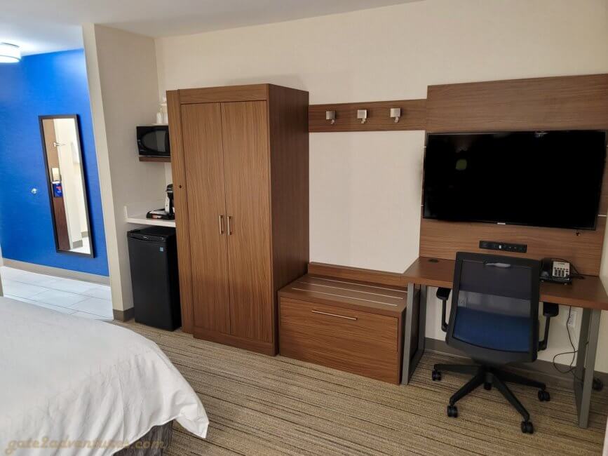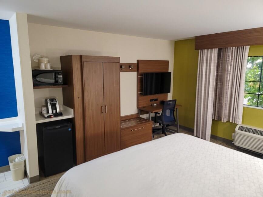 The King Bed has a nightstand on either side as well as headboard-mounted lights. The power outlets on either side of the bed also have two USB ports each. Directly opposite the bed is a large closet that also houses the in-room safe. To the left of the closet are a microwave, coffee maker, and medium-sized refrigerator.