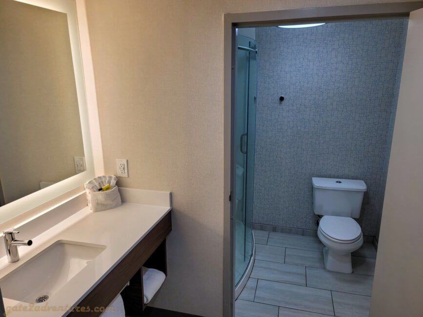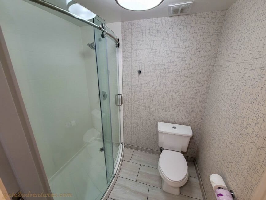 I really liked the bathroom. The shower has a neat convex sliding door. There are shampoo and conditioner dispensers inside the shower. Water pressure and temperature is great. Next to the shower is the toilet. This area has a door that separates it from the rest of the room. The vanity is outside the bathroom as well as all the towels.