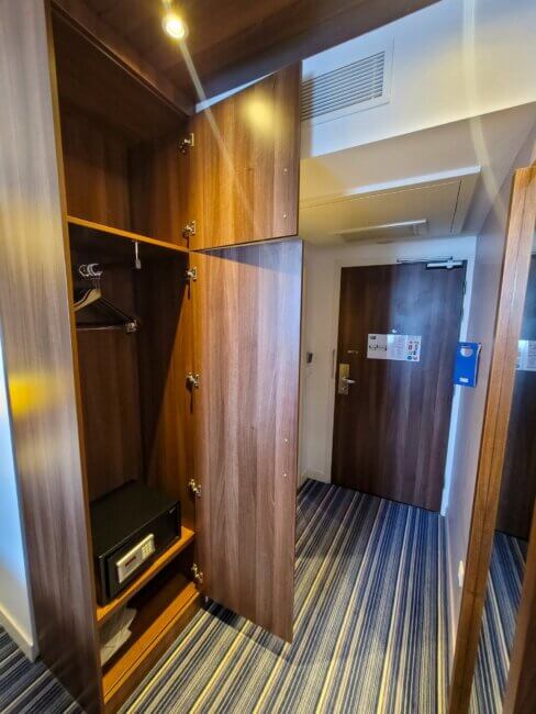 The closet next to the bed holds a safe as well as the laundry bag and paperwork for the dry-cleaning service besides the offered storage space.