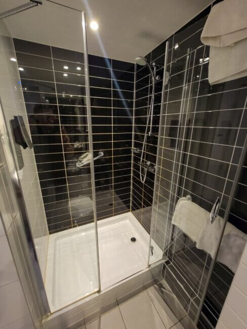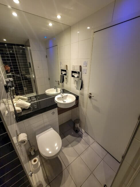 Next to the room door is the bathroom. It’s a rather small bathroom but big enough to not feel cramped in. The shower comes with a shower wand only and inside the shower is a single dispenser for multi-use soap, which was almost empty. The same dispenser is also next to the sink of the vanity. Above the vanity is a large wall-mounted mirror.