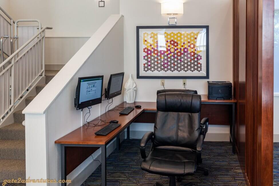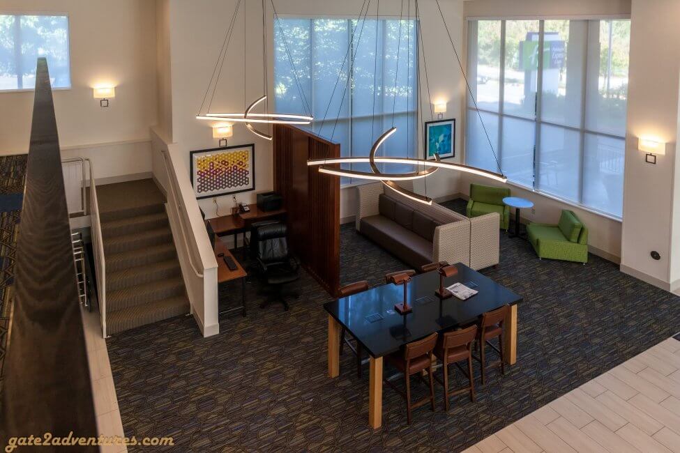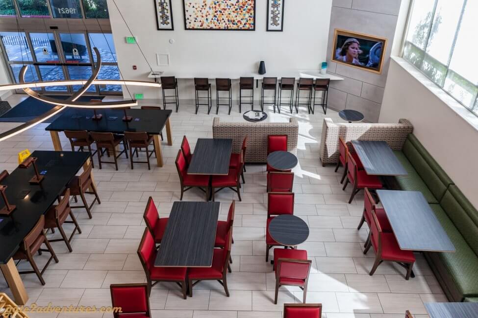 The lobby area offers a cozy area to hang out and sit down on the right side while entering. To the left is the breakfast area with lots of dining tables and chairs. There is a small business center with 2 workstations and one printer on the right side of the lobby just before the stairs to the mezzanine level.