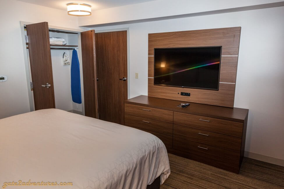 The bedroom is separated by a door from the living area which is next to the TV. In the middle of the room is the King-sized bed with a nightstand on either side. There are an alarm clock and room telephone on the nightstands. Either side of the bed also has a lamp with a separate switch, power outlets, and USB ports. Opposite the bed is another flatscreen TV which is also wall mounted. Below it is another closet/shelf combination with a few drawers for storage. Inside the bedroom, just behind the room door is a wall-closet. Inside the closet, you find an iron and ironing board in addition to hangers and additional blankets and pillows for the sofa bed.