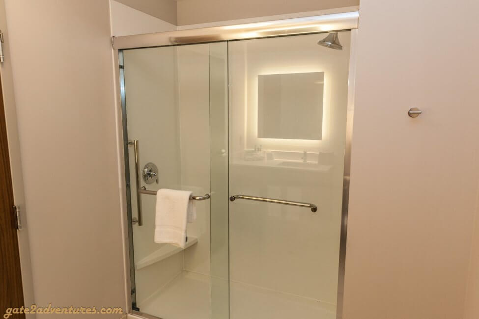 From the room entrance, there is a small hallway with the door to the bathroom. The bathroom is very spacious and comes with a walk-in shower with a glass wall and door. The vanity is located opposite the shower with a lighted mirror. The lights and ventilation fan turn on automatically via a motion sensor once you enter the room.