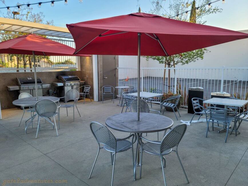 On the other end of the hotel building, you find the outdoor pool and patio which features two BBQ grills you can use and plenty of dining tables with sun umbrellas. There are a few pool loungers around the pool. I assume the amount got reduced because of the pandemic to keep space between the different loungers.