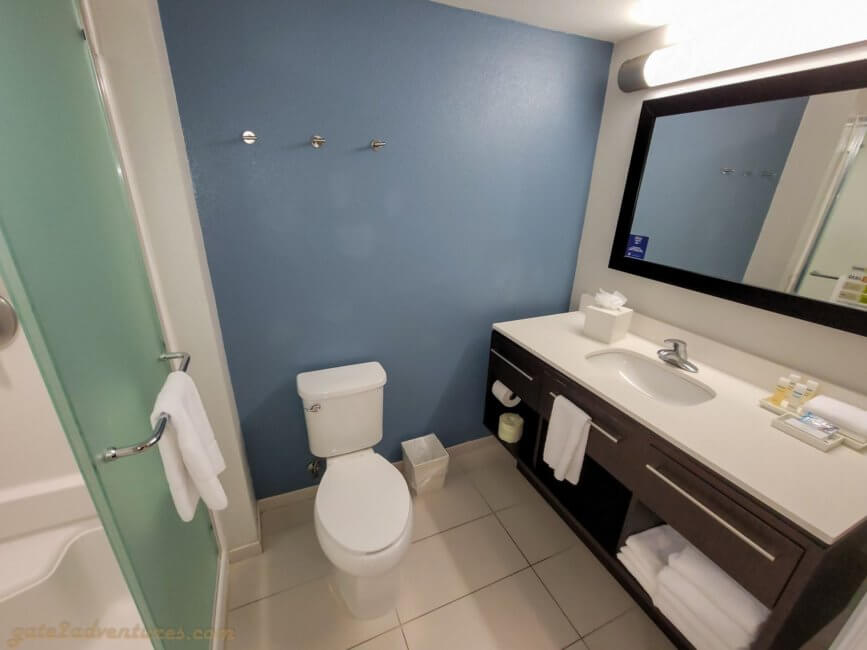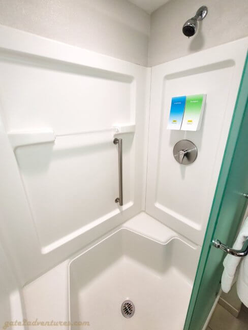 Opposite the kitchen space is the bathroom. It is quite spacious and features a walk-in shower. The shower has shampoo dispensers mounted to the wall but because of the pandemic, the vanity had a bunch of single-use shampoo bottles sitting on the counter.