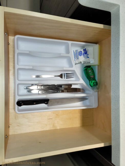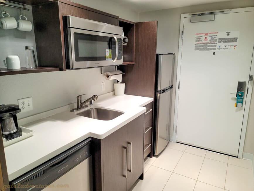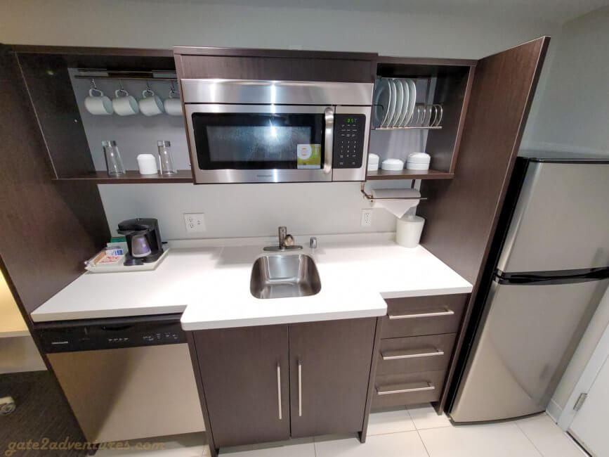 The room has a kitchen area immediately to the right when you enter the room. It features a full-size refrigerator, kitchen sink, microwave, coffee maker, and dishwasher besides utensils and dishware. My utensils drawer had a shortcoming on forks and no spoons at all. I assume housekeeping never checks if they are fully stocked. What’s missing is a toaster and a stove or stovetop.
