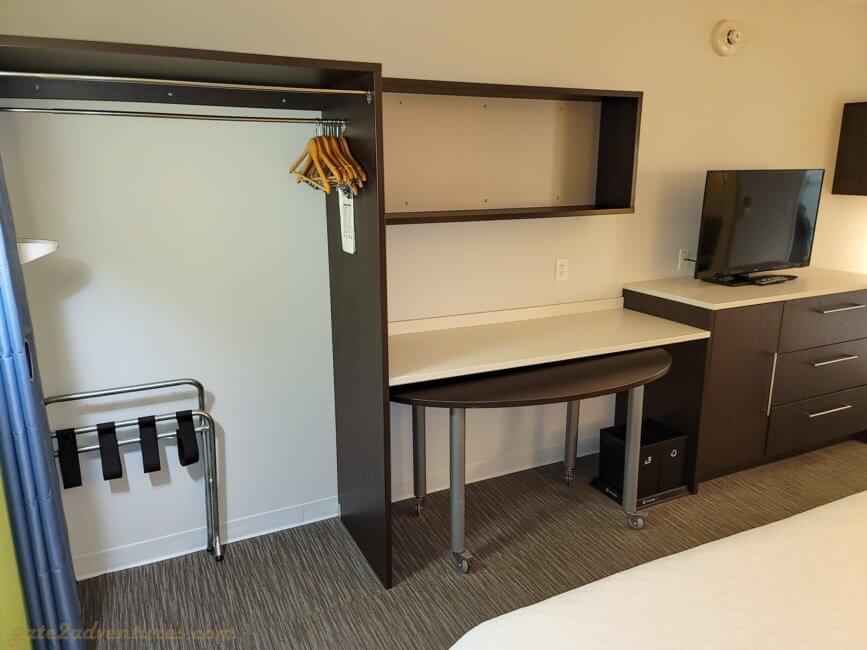 The right side of the room continuous with a work desk and office chair, followed by a closet with three drawers and a TV on top of it. After that is another desk-like area and a pull-out table followed by a tall closet for hanging your clothing which you can close with a curtain.